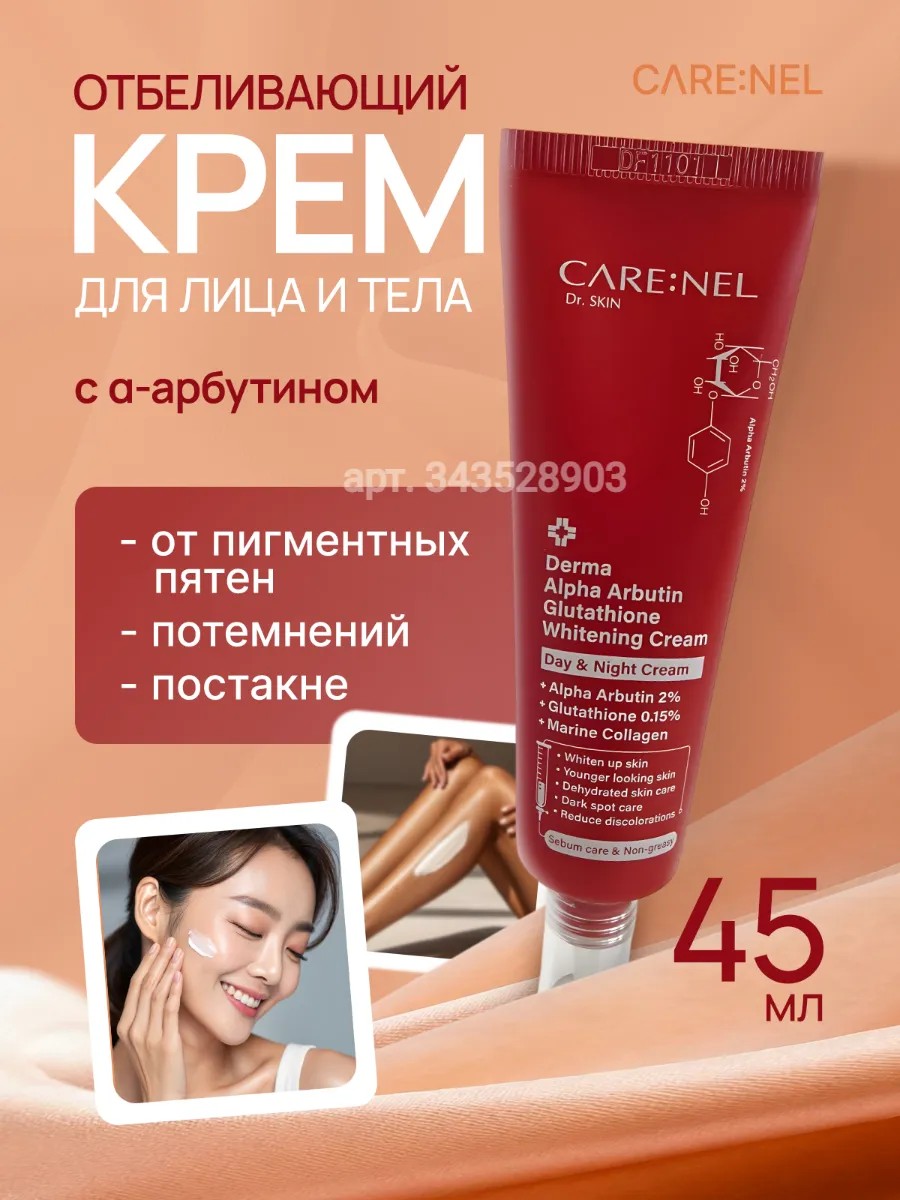 Крем для лица осветляющий с альфа-арбутином и глутатионом CARE:NEL Derma Alpha Arbutin Glutathione Whitening Cream эффективно борется с гиперпигментацией и увяданием кожи.