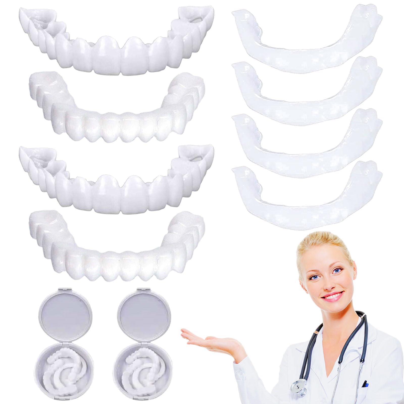 A radiant and charming smile - Upper and Lower False Teeth Veneers Customer service: We are committed to providing the best high quality service to all customers. If you have any questions about our clip-on teeth, please let us know. We will respond within 24 hours and do our best to ensure you have a pleasant shopping experience. Thank you for your trust and wish you a happy life! How to use: Step 1: Place the melting strip in hot water (about 90 degrees) Step 2: Fill the softened and melted adhesive strip into the denture cavity. Step 3: Place the denture in your mouth and bite down so it molds to your teeth. Step 4: After use, you can remove the glue and wash it with water before next use. Specification: Material: PE Package size: 9 × 9 × 3 cm Package weight: 70g White color Package included: 4 × Artificial teeth top and bottom (2 pairs) 4 × Adhesive strips (2 pairs) 2 × Storage box Warm tips: 1) When using hot water, pay attention to safety and avoid the risk of burns! 2) Recently, the packaging of this product has been upgraded, and a small tweezer has been added inside for your convenience. Feel free to use it, your satisfaction is our greatest pursuit.[Widely used]The cosmetic veneer teeth is light and portable. that you can wear on formal and informal occasions such as weddings, gatherings, concerts, lectures, studies, etc. If you have any questions about our dental Veneers, please feel free to contact us. [Easy to use]Perfect smile prostheses are very easy to use. Soak the silica gel strip in hot water first, then use mini tweezers to place the silica gel strip into the smile veneer teeth, and then press it onto your teeth. You can repeat the adjustment until you are satisfied. [Give you confidence]Wear a temporary dental prosthesis, which will give you more self-confidence to a certain extent. Moreover, it beautifies your teeth quickly and easily. With the temporary dental prosthesis you can shape or hide crooked, discolored, missing and incomplete teeth, making your teeth look more beautiful. [Safe to use]The whitening dentures conform well to your teeth and are a great alternative to expensive braces. The whitening dentures are made of environmentally friendly PP and food grade silicone, comfortable and no foreign body feeling, reliable and safe to use. [What's in the package]You will receive 2 sets of instant veneers for teeth on the top and bottom. Each pair of instant veneers teeth comes with 2 teethers and portable storage boxes, small tweezers, upper and lower teeth veneers, a manual to meet your daily needs.2 Paar Tijdelijke Tandprothese Top En Bodem Instant Fineer Tanden Kosmetische Veneers Tanden, Snap on Kunstgebitten Perfecte Glimlach Prothesen Mannen Vrouwen Perfecte Glimlach in Minuten Een stralende en charmante glimlach - Boven en onder valse tanden Veneers Klantenservice : We zijn toegewijd aan het leveren van de beste service van hoge kwaliteit aan alle klanten. Als u vragen heeft over onze clip-on tanden, laat het ons dan weten. We reageren binnen 24 uur en doen ons best om ervoor te zorgen dat u een prettige winkelervaring heeft. Ik dank u voor uw vertrouwen en wens u een gelukkig leven! Productomschrijving Hoe te gebruiken: Stap 1: Plaats de smeltstrip in heet water (ongeveer 90 graden) Stap 2: Vul de verzachte en gesmolten plakstrip in de protheseholte. Stap 3: Plaats de prothese in uw mond en bijt naar beneden zodat deze zich naar uw tanden vormt. Stap 4: Na gebruik kunt u de lijm verwijderen en met water wassen voor het volgende gebruik. Specificatie: Materiaal: PE Afmeting verpakking: 9 × 9 × 3 cm Pakket gewicht: 70g Witte kleur Pakket inbegrepen: 4 × Kunsttanden top en bodem(2 paar) 4 × Plakstrips (2 paar) 2 × Opbergdoos Warme tips: 1) Let bij het gebruik van heet water op de veiligheid en vermijd het risico op brandwonden! 2) Onlangs is de verpakking van dit product geüpgraded en voor uw gemak is er een klein pincet aan de binnenkant toegevoegd. Voel je vrij om het te gebruiken, je tevredenheid is ons grootste streven.[Veel gebruikt]De cosmetische fineertanden is licht en draagbaar. die u kunt dragen bij formele en informele gelegenheden zoals huwelijksfeesten, bijeenkomsten, concerten, lezingen, studies etc. Heeft u vragen over onze tandheelkundige Veneers, neem dan gerust contact met ons op. [Eenvoudig te gebruiken]Perfecte glimlach prothesen zijn zeer eenvoudig te gebruiken. Week de silicagelstrip eerst in heet water, gebruik vervolgens een minipincet om de silicagelstrip in de glimlach fineer tanden te plaatsen en druk hem vervolgens op uw tanden. U kunt de aanpassing herhalen totdat u tevreden bent. [Geef je vertrouwen]Draag een tijdelijke tandprothese, waardoor je tot op zekere hoogte meer zelfvertrouwen krijgt. Bovendien verfraait het uw tanden snel en gemakkelijk. Met de tijdelijke tandprothese kunt u scheve, verkleurde, ontbrekende en onvolledige tanden vormgeven of verbergen, waardoor uw tanden er mooier uitzien. [Veilig in gebruik]Het whitening-kunstgebitten past zich goed aan je tanden aan en is een geweldig alternatief voor dure beugels. De whitening-kunstgebitten zijn gemaakt van milieuvriendelijke PP en siliconen van voedingskwaliteit, comfortabel en geen gevoel van vreemd lichaam, betrouwbaar en veilig in gebruik. [Wat zit er in het pakket]Je ontvangt 2 sets instant veneers tanden aan de boven en onderkant. Elk paar instant veneers tanden wordt geleverd met 2 bijtringen en draagbare opbergdozen, een klein pincet, bovenste en onderste veneers tanden, een handleiding om aan uw dagelijkse behoeften te voldoen.