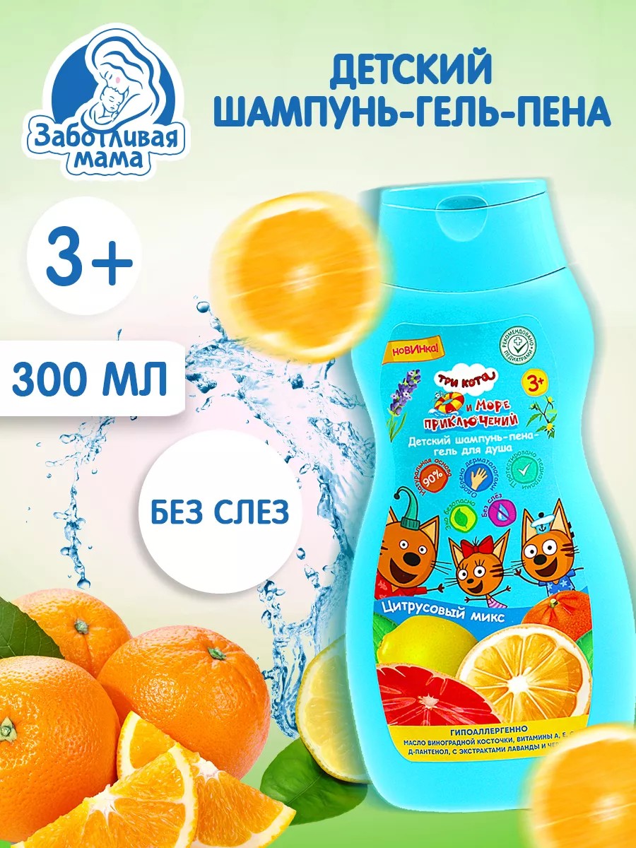 Детский шампунь-гель-пена «Три кота и море приключений. Цитрусовый микс» ТМ «Заботливая мама» непременно понравится вашему ребёнку: с экстрактами лаванды и череды; с маслом виноградной косточки; содержит витамины А, С, Е и D-пантенол; 90% натуральная основа; без парабенов.