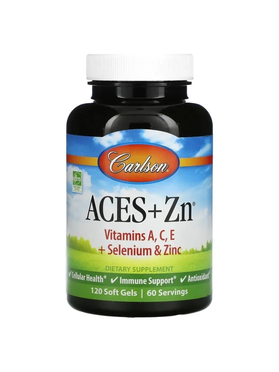Carlson ACES+Zn — это комплекс витаминов и минералов, который поддерживает здоровье и активность организма. В состав препарата входят важные антиоксиданты: витамины А, С, Е, а также селен и цинк, которые эффективно помогают защищать клетки от окислительного стресса и способствуют укреплению иммунной системы.Основные компоненты:- Витамин А: Способствует здоровью кожи и слизистых оболочек, поддерживает зрение и иммунитет.- Витамин С: Известен своими мощными антиоксидантными свойствами, улучшает усвоение железа, поддерживает здоровье сосудов и способствует заживлению тканей.- Витамин Е: Защищает клеточные мембраны от повреждений, играет важную роль в поддержании здоровья кожи и сердечно-сосудистой системы.- Селен: Необходим для нормального функционирования щитовидной железы и поддерживает антиоксидантные процессы в организме.- Цинк: Важен для нормального функционирования иммунной системы, способствует заживлению ран и поддерживает здоровье репродуктивной системы.Carlson ACES+Zn — это идеальный выбор для тех, кто заботится о своем здоровье и хочет обеспечить своему организму необходимые питательные вещества для повышения тонуса и общей жизненной энергии. Рекомендуется как дополнение к сбалансированному питанию и активному образу жизни.