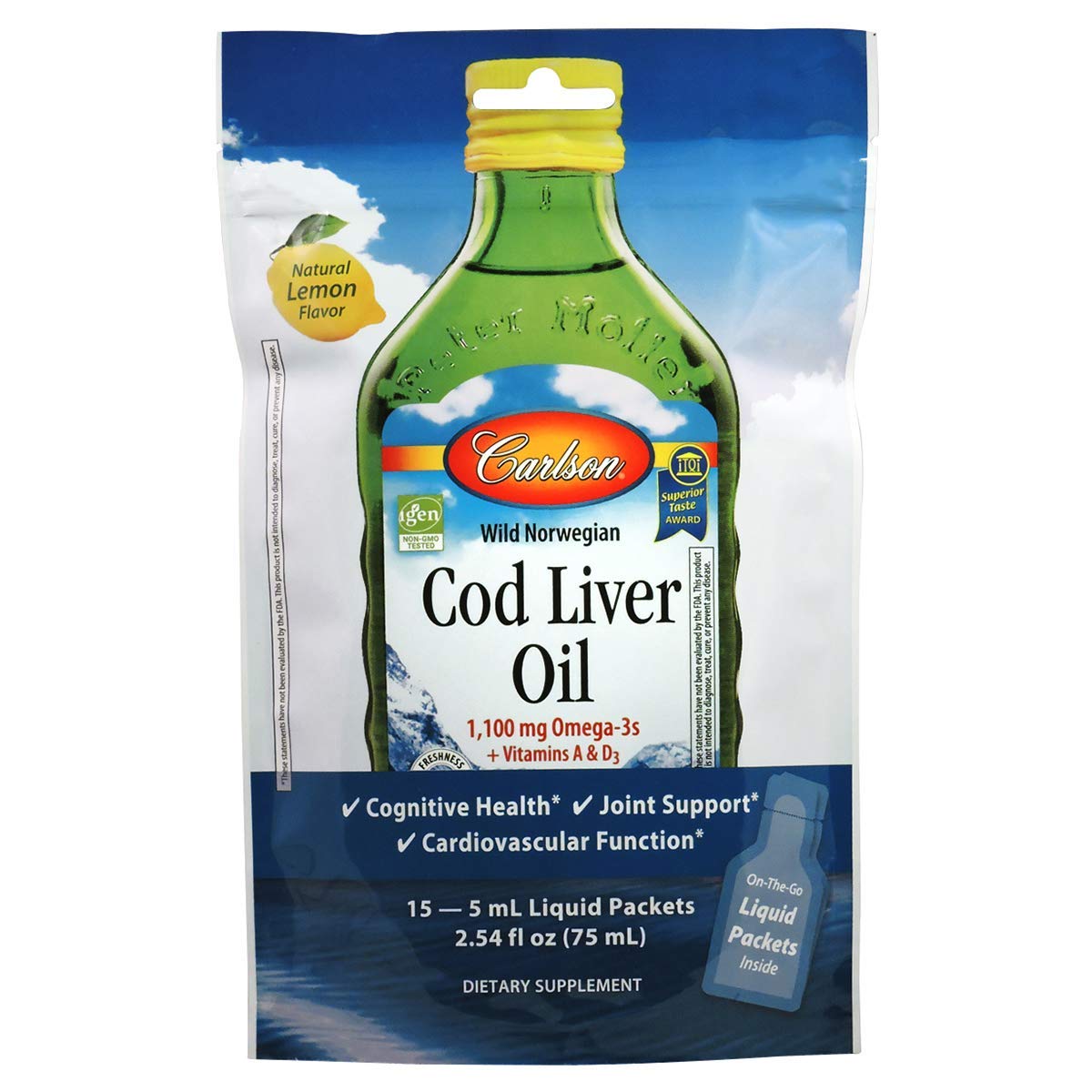 Carlson - Cod Liver Oil Grab + Go Packets, Travel Packs, Single-Serving, 1100 mg Omega-3s, Plus Vitamins A and D3, Norwegian, Wild Caught, Pouch of 15 Packets, 5 mL Each