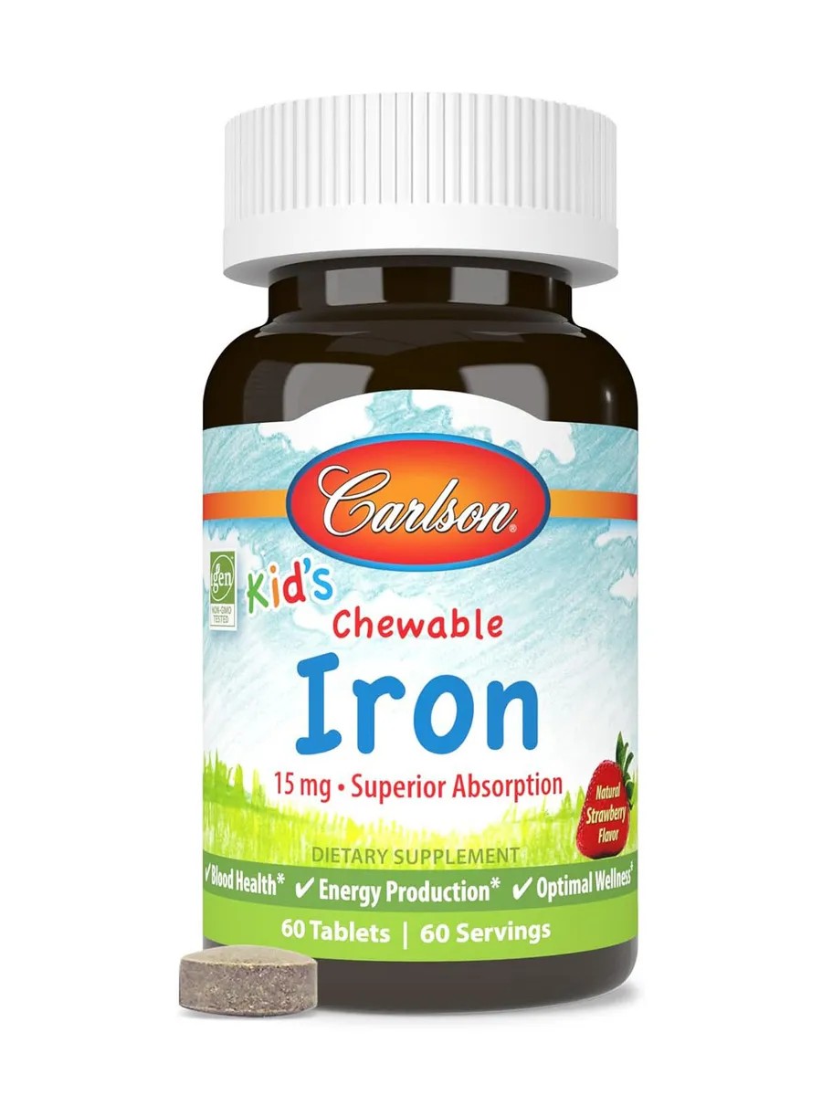 Carlson Children's Iron Chewable Tablets, Natural Strawberry Flavor, 15 mg, 60 Tablets is a US-made supplement with a delicious strawberry flavor, specially formulated to support normal iron levels in children and adolescents.