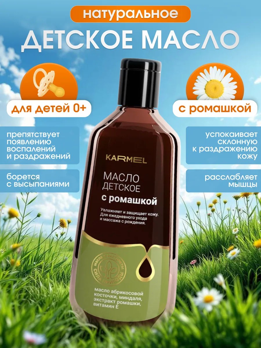 Детское масло с ромашкой Karmel (Кармель)— это гипоаллергенное увлажняющее масло для тела, созданное для ежедневного ухода за чувствительной кожей новорожденных и младенцев. Композиция масел абрикосовой косточки и миндаля, насыщенных ненасыщенными жирными кислотами, мягко питает кожу малыша,. Увлажняющее масло для детей оказывает успокаивающее действие, борется с воспалениями, раздражениями и высыпаниями, обеспечивая надёжный уход за кожей ребёнка с первых дней жизни.