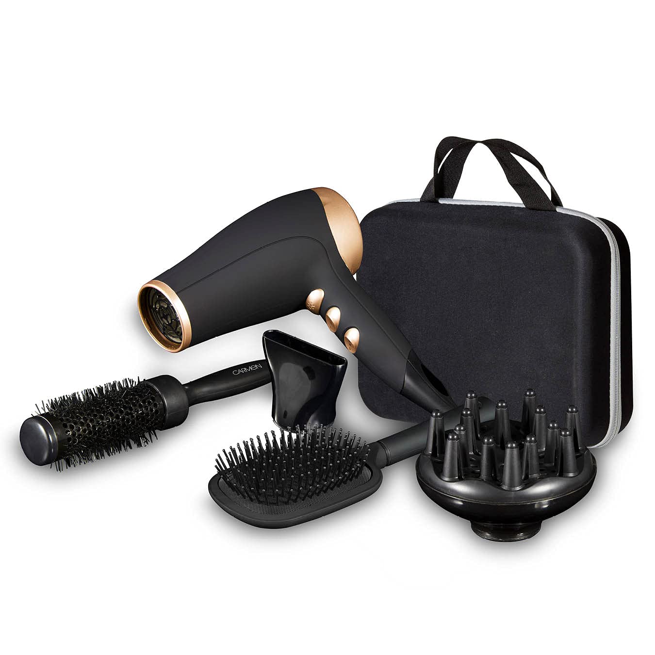CARMEN NOIR RANGE: A stylish range of hair and beauty essentials, coated in deep tones of black and grey complete with luxurious rose gold features. ACCESSORIES INCLUDED: All-in-one set comes with everything you need to achieve the best at-home blow dry, including paddle brush, volumising brush, concentrator nozzle, diffuser and storage case. PROFESSIONAL FINISH: Concentrator nozzle included for styling sectioned hair to create defined volume and texture. THREE HEAT AND TWO SPEED SETTINGS: Variable heat and speed settings capable of drying hair of all types with a smooth, glossy finish. LONG-LASTING STYLE: Cool shot setting secures your style in place for a long-lasting blow dry. POWERFUL 2200W OUTPUT: Powerful airflow dries hair quickly, leaving you with a professional, bouncing blow dry without salon prices.