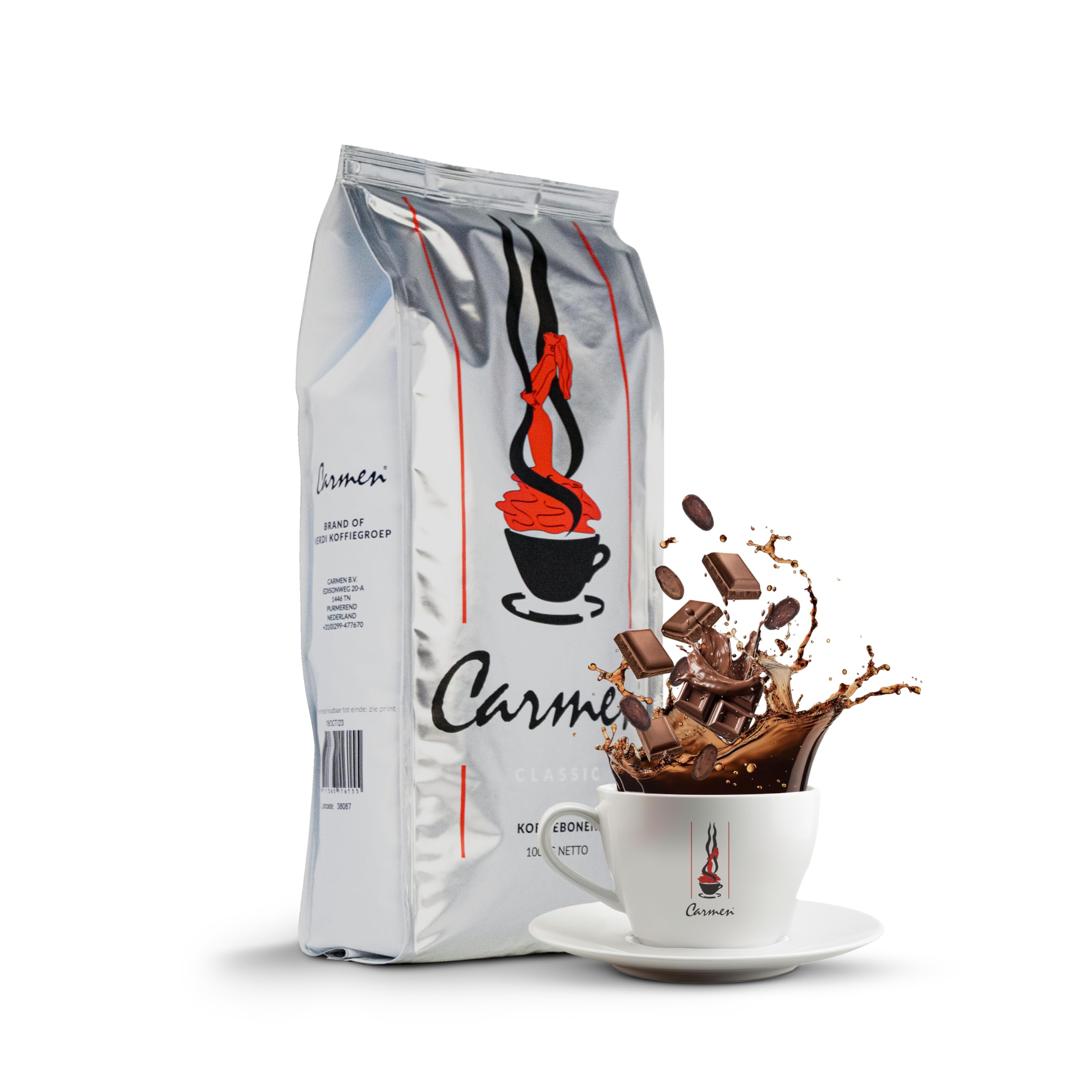 For those who aren't satisfied with just any cup, but live for the real deal. Carmen Classic is a full-bodied and powerful blend with deep notes of pure cacao, dark chocolate, and a warm, spicy finish. Dark roasted according to the Spanish recipe, it boasts a creamy body and an intense, lingering flavor. This blend of Arabica and Robusta beans has been carefully selected from leading regions such as Indonesia, Tanzania, Java, and Brazil—each known for its distinct flavor profile. Carmen Classic delivers a rich coffee experience that is perfectly showcased in a hearty espresso, cappuccino, or lungo. Flavor Profile: Cocoa, dark chocolate spicy warmth. Volatile, creamy powerful in balance. Coffee Strength: 6 9 – For those who like a firm coffee with finesse. Origin: Blend of Arabica Robusta from Indonesia, Tanzania, Java and Brazil. Branding: Dark roast in the Netherlands, at a low temperature for maximum flavor. Perfect for espresso machines, automatic vola-taposa, and cappuccino lovers.Carmen Grains de café classiques style espagnol 1000 gDESCRIPTION DU PRODUIT Pour ceux qui ne se contentent pas de la taille moyenne, mais vivent pour le vrai expresso. Carmen classique est un mélange corsé et puissant avec des notes profondes de cacao pur, de chocolat noir et une finale épicée chaude. Torréfié foncé selon la recette espagnole, avec un corps crémeux et une saveur intense qui persiste. Ce mélange de haricots Arabica et Robusta a été soigneusement composé de régions de premier plan comme l'Indonésie, la Tanzanie, Java et le Brésil - connus pièce par pièce pour leur profil de saveur distinct. Carmen Classic offre une expérience de café riche qui est parfaitement mise en valeur dans un expresso, un cappuccino ou un lungo copieux. Profil de goût Cacao, chocolat foncé chaleur épicée Vol, crémeux puissant en équilibre Force du café 6 9 – Pour ceux qui aiment le café ferme avec finesse Origine mélange d'Arabica Robusta d'Indonésie, de Tanzanie, de Java et du Brésil Branding torréfaction foncée aux Pays-Bas, à basse température pour un maximum de goût Parfait Pour machines à expresso, vola. automatiques et amateurs de cappuccino