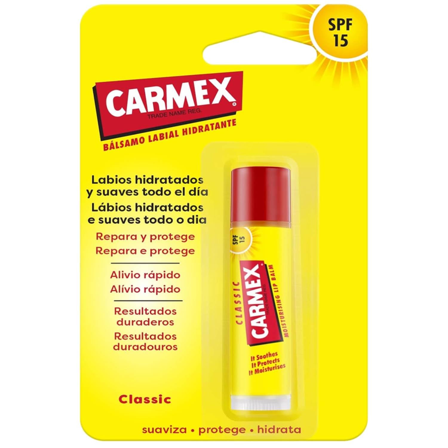 Carmex Lip Balm is the perfect solution for caring for dry and dehydrated lips, with a wide range of irresistible flavors and scents. Each version is formulated to provide intense and long-lasting hydration, while protecting lips from the elements with premium ingredients such as menthol and cocoa butter. The various flavors and scents, from fresh and fruity to sweet and comforting, offer a unique sensory experience, making every application a moment of pleasure. Whether you prefer the freshness of cherry, the sweet taste of cherry, or the exotic fragrance of watermelon, Carmex offers a choice to suit every taste, for lips that are always soft, smooth, and protected. SAFETY WARNING For external use onlyWhether you prefer the freshness of cherry, the sweet taste of cherry, or the exotic fragrance of watermelon, Carmex offers a choice to suit every taste, for lips that are always soft, smooth, and protected. The different flavors and aromas, ranging from fresh and fruity to sweet and comforting, offer a unique sensory experience, making each application a moment of pleasure. Each version is formulated to provide intense and long-lasting hydration, while protecting lips from the elements with premium ingredients such as menthol and cocoa butter. Carmex Lip Balm is the perfect solution for caring for dry and dehydrated lips, with a wide range of irresistible scents and flavors.Carmex Baume Lèvres Classique Hydratant Spf 15 1 UnitéDESCRIPTION DU PRODUIT DESCRIPTION DU PRODUIT Carmex Baume à lèvres est la solution parfaite pour prendre soin des lèvres sèches et déshydratées, avec une large gamme de variantes aux parfums et goûts irrésistibles. Chaque version est formulée pour offrir une hydratation intense et durable, tout en protégeant les lèvres des intempéries grâce à des ingrédients de qualité supérieure tels que le menthol et le beurre de cacao. Les différentes variantes de goût et de parfum, allant du frais et fruité au doux et enveloppant, offrent une expérience sensorielle unique, rendant chaque application un moment de plaisir. Que vous préfériez la fraîcheur de la cerise, la saveur douce de la cerise ou le parfum exotique à la pastèque, Carmex offre un choix adapté à tous les goûts, pour des lèvres toujours douces, lisses et protégées. AVERTISSEMENT DE SÉCURITÉ Usage extérieur uniquementQue vous préfériez la fraîcheur de la cerise, la saveur douce de la cerise ou le parfum exotique à la pastèque, Carmex offre un choix adapté à tous les goûts, pour des lèvres toujours douces, lisses et protégées. Les différentes variantes de goût et de parfum, allant du frais et fruité au doux et enveloppant, offrent une expérience sensorielle unique, rendant chaque application un moment de plaisir. Chaque version est formulée pour offrir une hydratation intense et durable, tout en protégeant les lèvres des intempéries grâce à des ingrédients de qualité supérieure tels que le menthol et le beurre de cacao. Carmex Baume à lèvres est la solution parfaite pour prendre soin des lèvres sèches et déshydratées, avec une large gamme de variantes aux parfums et goûts irrésistibles.