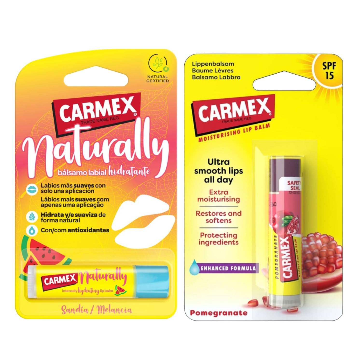 Carmex Lip Balm is the perfect solution for caring for dry and dehydrated lips, with a wide range of irresistible flavors and scents. Each version is formulated to provide intense and long-lasting hydration, while protecting lips from the elements with premium ingredients such as menthol and cocoa butter. The various flavors and scents, from fresh and fruity to sweet and comforting, offer a unique sensory experience, making every application a moment of pleasure. Whether you prefer the freshness of cherry, the sweet taste of cherry, or the exotic fragrance of watermelon, Carmex offers a choice to suit every taste, for lips that are always soft, smooth, and protected. SAFETY WARNING For external use onlyWhether you prefer the freshness of cherry, the sweet taste of cherry, or the exotic fragrance of watermelon, Carmex offers a choice to suit every taste, for lips that are always soft, smooth, and protected. The different flavors and aromas, ranging from fresh and fruity to sweet and comforting, offer a unique sensory experience, making each application a moment of pleasure. Each version is formulated to provide intense and long-lasting hydration, while protecting lips from the elements with premium ingredients such as menthol and cocoa butter. Carmex Lip Balm is the perfect solution for caring for dry and dehydrated lips, with a wide range of irresistible scents and flavors.Carmex Baume Lèvres Hydratant Combo Naturally Pastèque Et Grenade Spf 15DESCRIPTION DU PRODUIT DESCRIPTION DU PRODUIT Carmex Baume à lèvres est la solution parfaite pour prendre soin des lèvres sèches et déshydratées, avec une large gamme de variantes aux parfums et goûts irrésistibles. Chaque version est formulée pour offrir une hydratation intense et durable, tout en protégeant les lèvres des intempéries grâce à des ingrédients de qualité supérieure tels que le menthol et le beurre de cacao. Les différentes variantes de goût et de parfum, allant du frais et fruité au doux et enveloppant, offrent une expérience sensorielle unique, rendant chaque application un moment de plaisir. Que vous préfériez la fraîcheur de la cerise, la saveur douce de la cerise ou le parfum exotique à la pastèque, Carmex offre un choix adapté à tous les goûts, pour des lèvres toujours douces, lisses et protégées. AVERTISSEMENT DE SÉCURITÉ Usage extérieur uniquementQue vous préfériez la fraîcheur de la cerise, la saveur douce de la cerise ou le parfum exotique à la pastèque, Carmex offre un choix adapté à tous les goûts, pour des lèvres toujours douces, lisses et protégées. Les différentes variantes de goût et de parfum, allant du frais et fruité au doux et enveloppant, offrent une expérience sensorielle unique, rendant chaque application un moment de plaisir. Chaque version est formulée pour offrir une hydratation intense et durable, tout en protégeant les lèvres des intempéries grâce à des ingrédients de qualité supérieure tels que le menthol et le beurre de cacao. Carmex Baume à lèvres est la solution parfaite pour prendre soin des lèvres sèches et déshydratées, avec une large gamme de variantes aux parfums et goûts irrésistibles.