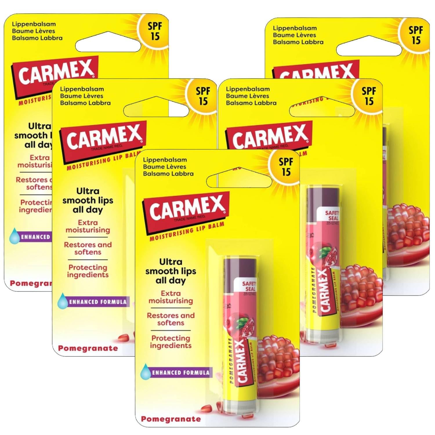 Carmex Lip Balm is the perfect solution for caring for dry and dehydrated lips, with a wide range of irresistible flavors and scents. Each version is formulated to provide intense and long-lasting hydration, while protecting lips from the elements with premium ingredients such as menthol and cocoa butter. The various flavors and scents, from fresh and fruity to sweet and comforting, offer a unique sensory experience, making every application a moment of pleasure. Whether you prefer the freshness of cherry, the sweet taste of cherry, or the exotic fragrance of watermelon, Carmex offers a choice to suit every taste, for lips that are always soft, smooth, and protected. SAFETY WARNING For external use onlyWhether you prefer the freshness of cherry, the sweet taste of cherry, or the exotic fragrance of watermelon, Carmex offers a choice to suit every taste, for lips that are always soft, smooth, and protected. The different flavors and aromas, ranging from fresh and fruity to sweet and comforting, offer a unique sensory experience, making each application a moment of pleasure. Each version is formulated to provide intense and long-lasting hydration, while protecting lips from the elements with premium ingredients such as menthol and cocoa butter. Carmex Lip Balm is the perfect solution for caring for dry and dehydrated lips, with a wide range of irresistible scents and flavors.Carmex Grenade Baume Lèvres Ultra Hydratant Spf 15 5 UnitésDESCRIPTION DU PRODUIT DESCRIPTION DU PRODUIT Carmex Baume à lèvres est la solution parfaite pour prendre soin des lèvres sèches et déshydratées, avec une large gamme de variantes aux parfums et goûts irrésistibles. Chaque version est formulée pour offrir une hydratation intense et durable, tout en protégeant les lèvres des intempéries grâce à des ingrédients de qualité supérieure tels que le menthol et le beurre de cacao. Les différentes variantes de goût et de parfum, allant du frais et fruité au doux et enveloppant, offrent une expérience sensorielle unique, rendant chaque application un moment de plaisir. Que vous préfériez la fraîcheur de la cerise, la saveur douce de la cerise ou le parfum exotique à la pastèque, Carmex offre un choix adapté à tous les goûts, pour des lèvres toujours douces, lisses et protégées. AVERTISSEMENT DE SÉCURITÉ Usage extérieur uniquementQue vous préfériez la fraîcheur de la cerise, la saveur douce de la cerise ou le parfum exotique à la pastèque, Carmex offre un choix adapté à tous les goûts, pour des lèvres toujours douces, lisses et protégées. Les différentes variantes de goût et de parfum, allant du frais et fruité au doux et enveloppant, offrent une expérience sensorielle unique, rendant chaque application un moment de plaisir. Chaque version est formulée pour offrir une hydratation intense et durable, tout en protégeant les lèvres des intempéries grâce à des ingrédients de qualité supérieure tels que le menthol et le beurre de cacao. Carmex Baume à lèvres est la solution parfaite pour prendre soin des lèvres sèches et déshydratées, avec une large gamme de variantes aux parfums et goûts irrésistibles.