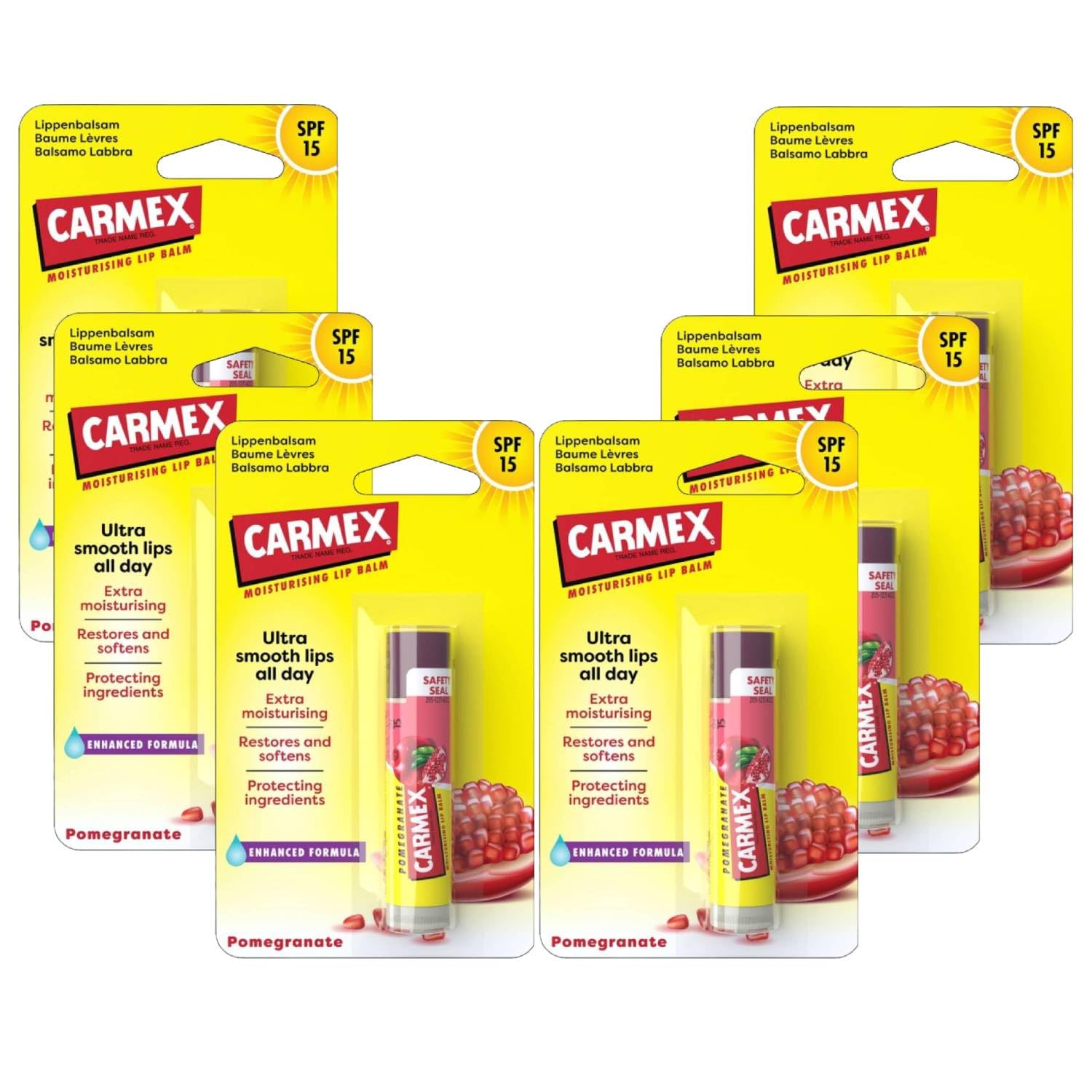Carmex Lip Balm is the perfect solution for caring for dry and dehydrated lips, with a wide range of irresistible flavors and scents. Each version is formulated to provide intense and long-lasting hydration, while protecting lips from the elements with premium ingredients such as menthol and cocoa butter. The various flavors and scents, from fresh and fruity to sweet and comforting, offer a unique sensory experience, making every application a moment of pleasure. Whether you prefer the freshness of cherry, the sweet taste of cherry, or the exotic fragrance of watermelon, Carmex offers a choice to suit every taste, for lips that are always soft, smooth, and protected. SAFETY WARNING For external use onlyWhether you prefer the freshness of cherry, the sweet taste of cherry, or the exotic fragrance of watermelon, Carmex offers a choice to suit every taste, for lips that are always soft, smooth, and protected. The different flavors and aromas, ranging from fresh and fruity to sweet and comforting, offer a unique sensory experience, making each application a moment of pleasure. Each version is formulated to provide intense and long-lasting hydration, while protecting lips from the elements with premium ingredients such as menthol and cocoa butter. Carmex Lip Balm is the perfect solution for caring for dry and dehydrated lips, with a wide range of irresistible scents and flavors.Carmex Grenade Baume Lèvres Ultra Hydratant Spf 15 6 UnitésDESCRIPTION DU PRODUIT DESCRIPTION DU PRODUIT Carmex Baume à lèvres est la solution parfaite pour prendre soin des lèvres sèches et déshydratées, avec une large gamme de variantes aux parfums et goûts irrésistibles. Chaque version est formulée pour offrir une hydratation intense et durable, tout en protégeant les lèvres des intempéries grâce à des ingrédients de qualité supérieure tels que le menthol et le beurre de cacao. Les différentes variantes de goût et de parfum, allant du frais et fruité au doux et enveloppant, offrent une expérience sensorielle unique, rendant chaque application un moment de plaisir. Que vous préfériez la fraîcheur de la cerise, la saveur douce de la cerise ou le parfum exotique à la pastèque, Carmex offre un choix adapté à tous les goûts, pour des lèvres toujours douces, lisses et protégées. AVERTISSEMENT DE SÉCURITÉ Usage extérieur uniquementQue vous préfériez la fraîcheur de la cerise, la saveur douce de la cerise ou le parfum exotique à la pastèque, Carmex offre un choix adapté à tous les goûts, pour des lèvres toujours douces, lisses et protégées. Les différentes variantes de goût et de parfum, allant du frais et fruité au doux et enveloppant, offrent une expérience sensorielle unique, rendant chaque application un moment de plaisir. Chaque version est formulée pour offrir une hydratation intense et durable, tout en protégeant les lèvres des intempéries grâce à des ingrédients de qualité supérieure tels que le menthol et le beurre de cacao. Carmex Baume à lèvres est la solution parfaite pour prendre soin des lèvres sèches et déshydratées, avec une large gamme de variantes aux parfums et goûts irrésistibles.