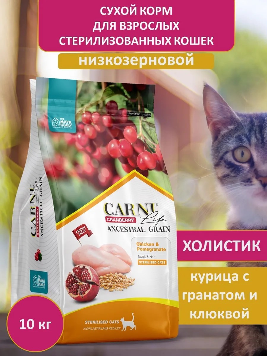Carni Life dry cat food is a balanced, complete diet for maintaining your cat's health. This natural cat food consists of high-quality ingredients and is ideal for adult cats in their prime, as well as spayed and neutered cats. This low-grain, holistic cat food is made with chicken, duck, and turkey—sources of high-quality, highly digestible proteins. Dried egg is also added to the diet, increasing the nutritional value. This dry cat food helps prevent urolithiasis, as it contains cranberry, and its optimal balance of micronutrients prevents the formation of kidney stones. This diet is suitable for both spayed and neutered cats. Additionally, this cat food contains unique and beneficial ingredients. Pea fiber promotes smooth gastrointestinal function, while prebiotics improve intestinal microflora. Omega for cats improves metabolism and immunity. Carni Life cat food includes minerals and vitamins that support overall health. This dry cat food contains taurine, which is responsible for eye health. Holistic dry cat food also contains L-carnitine, which regulates metabolism. This cat food is manufactured in Turkey at a modern facility using the latest technologies and high-quality raw materials. Cat food is available in a variety of flavors: lamb-flavored cat food, beef-flavored cat food for adult cats, salmon-flavored cat food for sterilized cats, and chicken-flavored cat food for sterilized cats. Holistic dry cat food is suitable for absolutely all cats. The properly balanced composition of Carni Life cat food provides your pet with all the necessary macro- and microelements, minerals, and amino acids. Stay healthy!
