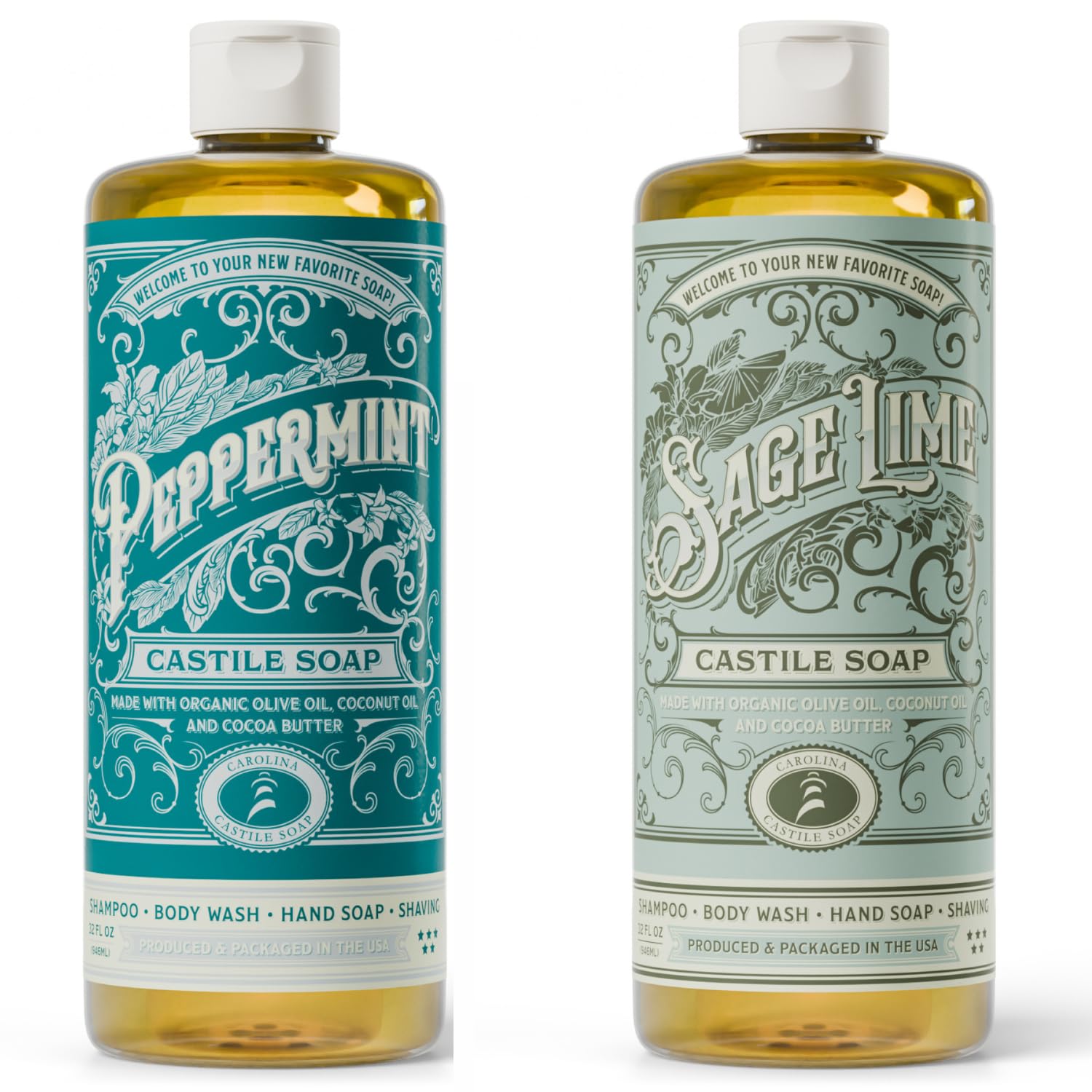 Carolina Castile Soap Carolina Peppermint and Sage Lime Castile Soap Liquid - 32 oz Vegan & Pure Organic Concentrated Non Drying All Natural Formula Body Wash & Shampoo