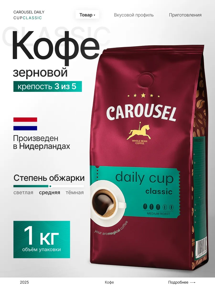 Откройте для себя истинное наслаждение с нашим зерновым кофе средней обжарки CAROUSEL Classic 1000г от голландского бренда CAROUSEL . Мы привезли для вас частичку голландского уюта и мастерства, чтобы каждое утро начиналось с идеальной чашки ароматного напитка.Европейский производитель тщательно обжаривает отборные зерна арабики и робусты до золотисто-коричневого цвета, раскрывая всю глубину их вкуса. Средняя обжарка придает натуральному кофе Карусель классик сбалансированный характер: он в меру крепкий и не кислый, обладает приятной сладостью и насыщенным ароматом. Вы почувствуете нотки шоколада и карамели, которые делают каждую глоток незабываемым.Классический кофе идеально подходит для большинства способов приготовления кофе, будь то кофемашина, капельная кофеварка, френч-пресс или гейзерная кофеварка. Используйте жерновую кофемолку, чтобы избежать перегрева зерен и сохранить их аромат.Этот кофе станет вашим верным спутником в любое время дня. Он прекрасно подойдет для утреннего пробуждения, освежающего перерыва в течение дня или уютного вечера. Почему стоит выбрать этот кофе? Насыщенный аромат: Откройте упаковку и почувствуйте, как вас окутывает волшебный аромат свежеобжаренного кофе. Сбалансированный вкус: Насладитесь гармоничным сочетанием сладости, легкой кислинки и приятной горчинки. Простота приготовления: Благодаря среднему помолу, вы легко приготовите идеальную чашку кофе дома, не прилагая особых усилий. Этот молотый кофе прекрасно раскрывается при любом способе приготовления, будь то американо, капучино, эспрессо или латте. Смело выбирайте любой способ приготовления и наслаждайтесь им дома, в офисе или в дороге. Отличный подарок: Пачка натурального молотого кофе среднего помола и средней обжарки– это всегда беспроигрышный вариант подарка на любой праздник и без всякого повода! Отборные кофейные зерна дарят напитку непревзойденный вкус, которым хочется поделиться и подарить другу, маме, подруге, учителю или любому другому близкому человеку.Закажите CAROUSEL прямо сейчас и почувствуйте вкус удовольствия в каждой чашке!