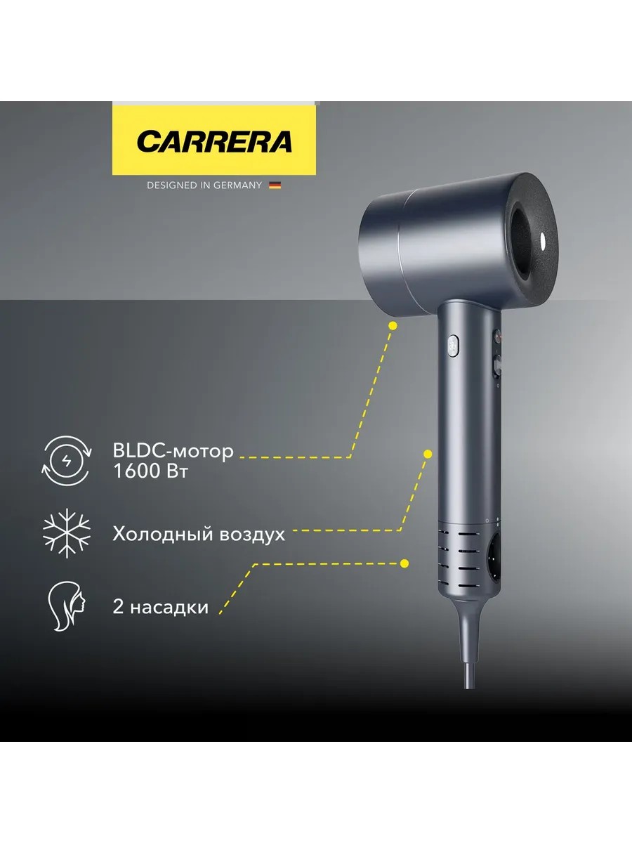 Фен Carrera CRD535 в актуальном дизайне обладает мощностью 1600 Вт и быстро высушит волосы любой длины. В модели используется современный двигатель BLDC - он прослужит в четыре раза дольше, чем двигатель AC, который раньше использовался в профессиональных фенах, и в 10 раз дольше, чем двигатель DC, который устанавливают в бытовых моделях. Фен с таким двигателем очень тихий, можно сушить волосы и разговаривать одновременно. Благодаря скорости 110000 об/мин фен за 2-3 минуты высушит даже длинные и густые волосы. Комбинируя три скорости и четрые температурных режима (холодный воздух, теплый воздух, умеренно горячий воздух и горячий воздух), можно легко подобрать настройки, идеальные для любых волос. В зависимости от выбранной температуры сушки цвет индикатора на ручке фена будет менять цвет. Встроенный генератор ионов создает 50 миллионов отрицательно заряженных частиц на 1 см³ - волосы не будут электризоваться во время сушки, станут более гладкими, шелковистыми и послушными, а также останутся увлажненными. Для создания сложных укладок и придания объема в комплект входят два концентратора на магнитном креплении. Их не нужно вкручивать, достаточно прикоснуться насадкой к соплу фена, чтобы она надежно прикрепилась. Закрепить укладку поможет функция холодного воздуха. В ручку фена встроен сеточный фильтр - его можно легко снять и очистить, чтобы фен всегда был чистым и прослужил еще дольше.