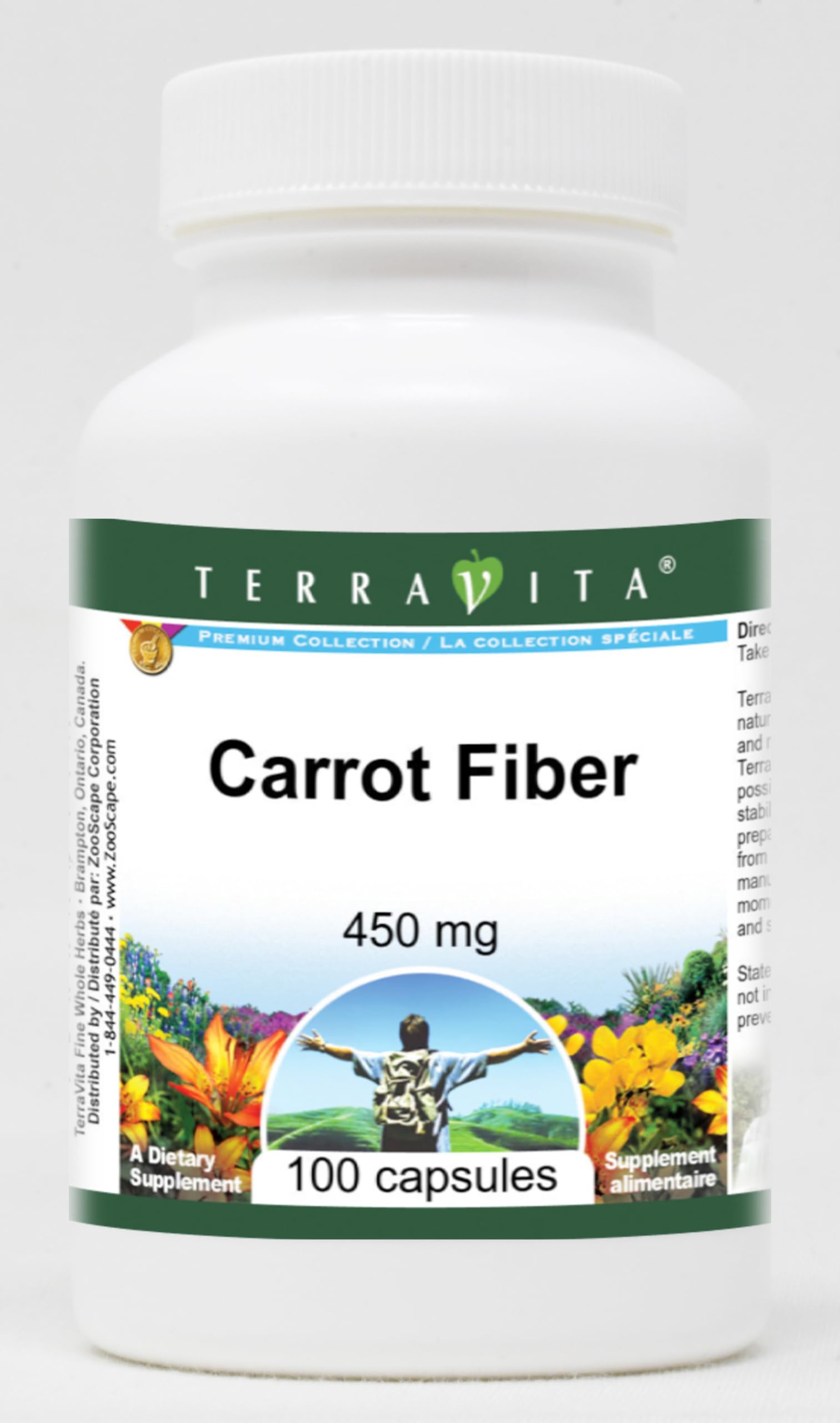 Carrot Fiber - 450 mg (100 capsules, ZIN: 519521) Packaged in the United States in a GMP certified facility (Good Manufacturing Practice). No fillers. Manufacturer: TerraVita Size: 100 capsules Easy-to-swallow Capsules in a sealed bottle. Ingredients: Gelatin, Water, Carrot Fiber - 450 mg