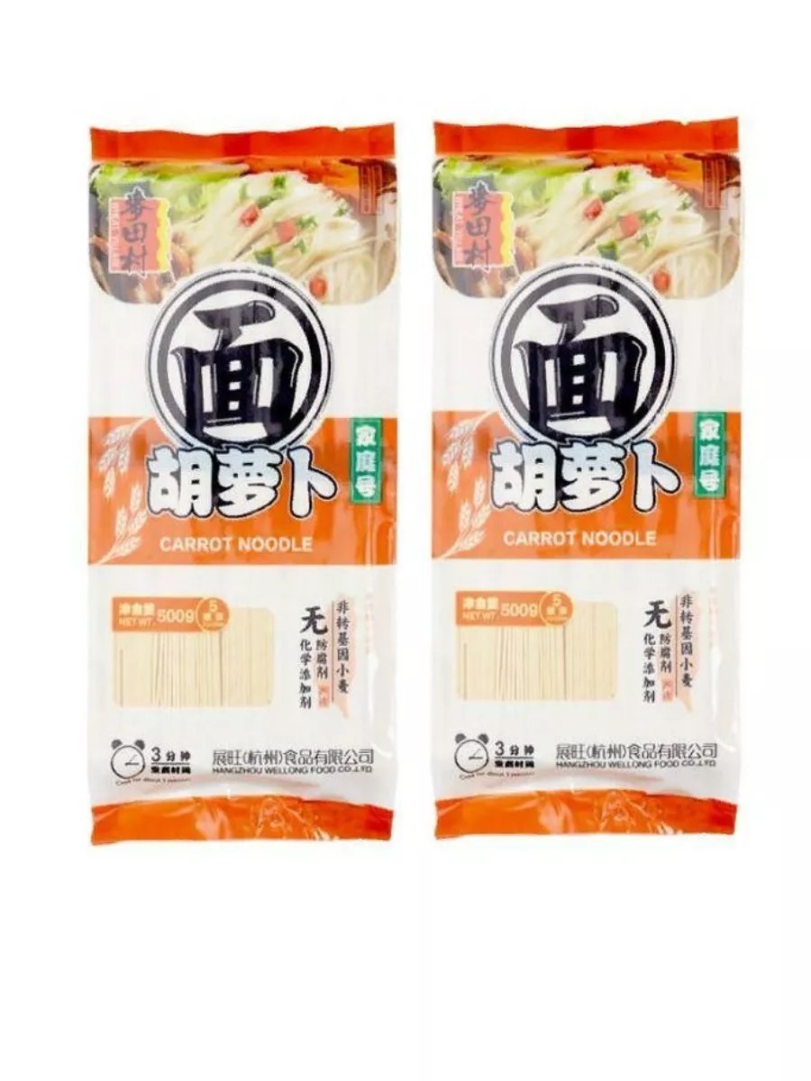 Carrot Noodles, 500g, 2 pcs. Thin wheat noodles with added carrot powder are perfect for traditional Asian soups, as well as for stir-frying. The noodles cook for just 3 minutes! After cooking, be sure to rinse them under cold water! Ingredients: Wheat flour 94.8%, carrot powder 3.2%, salt 2%.