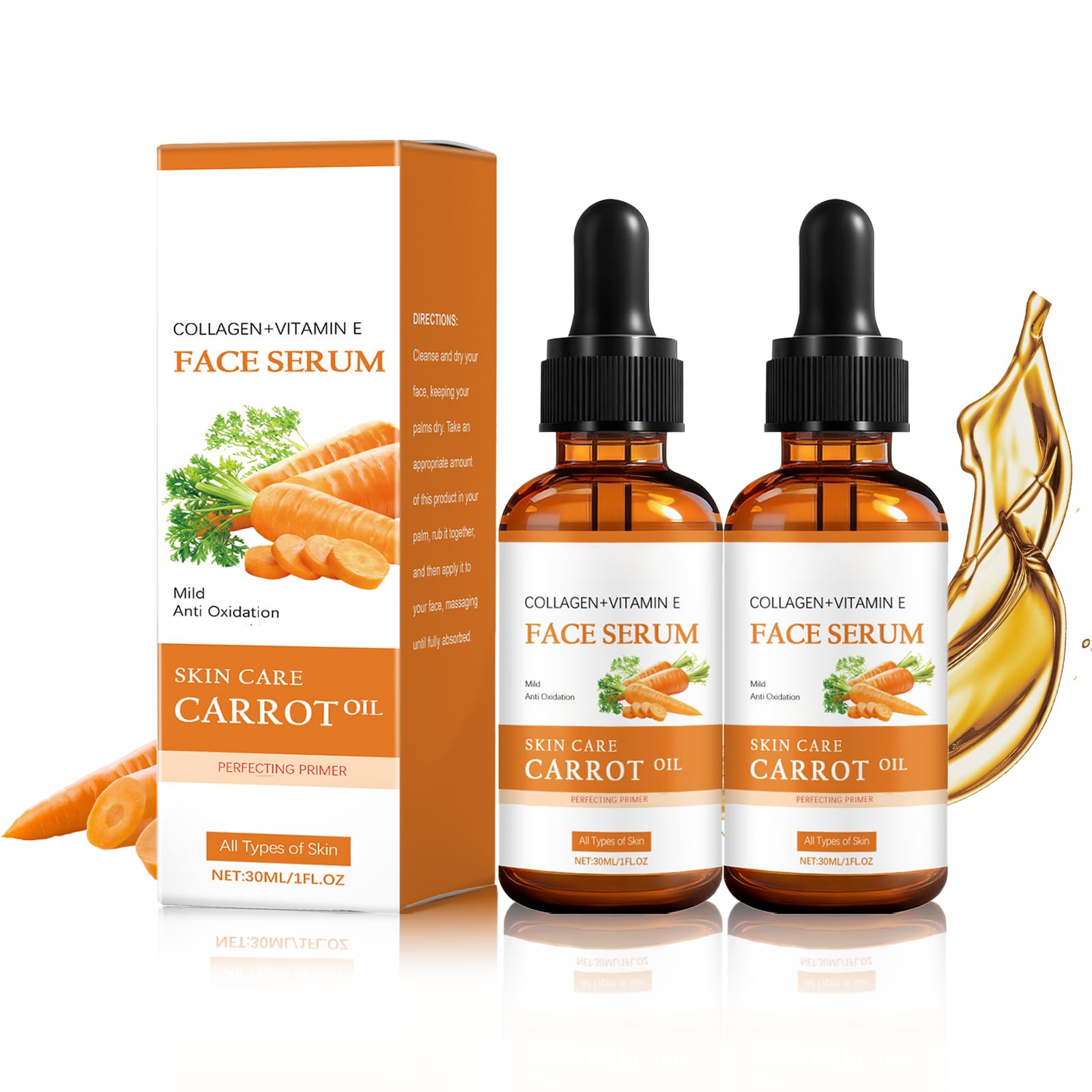 ? SEEKING HEALTHY SKIN GLOW? ? Dull, Uneven Tone ? Loss of Firmness ? Fine Lines ? Lack of Moisture DISCOVER CARROT SEED COLLAGEN SERUM Anti-Wrinkle, Firming Even Toning ? ✓ VISIBLE GLOW: Nourishes skin for a healthy, radiant complexion. ✓ FIRMS SMOOTHES: Helps improve skin elasticity and fine lines. ✓ EVENS SKIN TONE: Works to reduce dullness for a more uniform look. ✓ DEEP MOISTURIZATION: Carrot oil and Vitamin E hydrate skin deeply. SPECIFICATIONS: Name: Carrot Seed Collagen Face Serum Volume: 30ml x 2 Bottles Key Features: With Vitamin E, For Face Hair