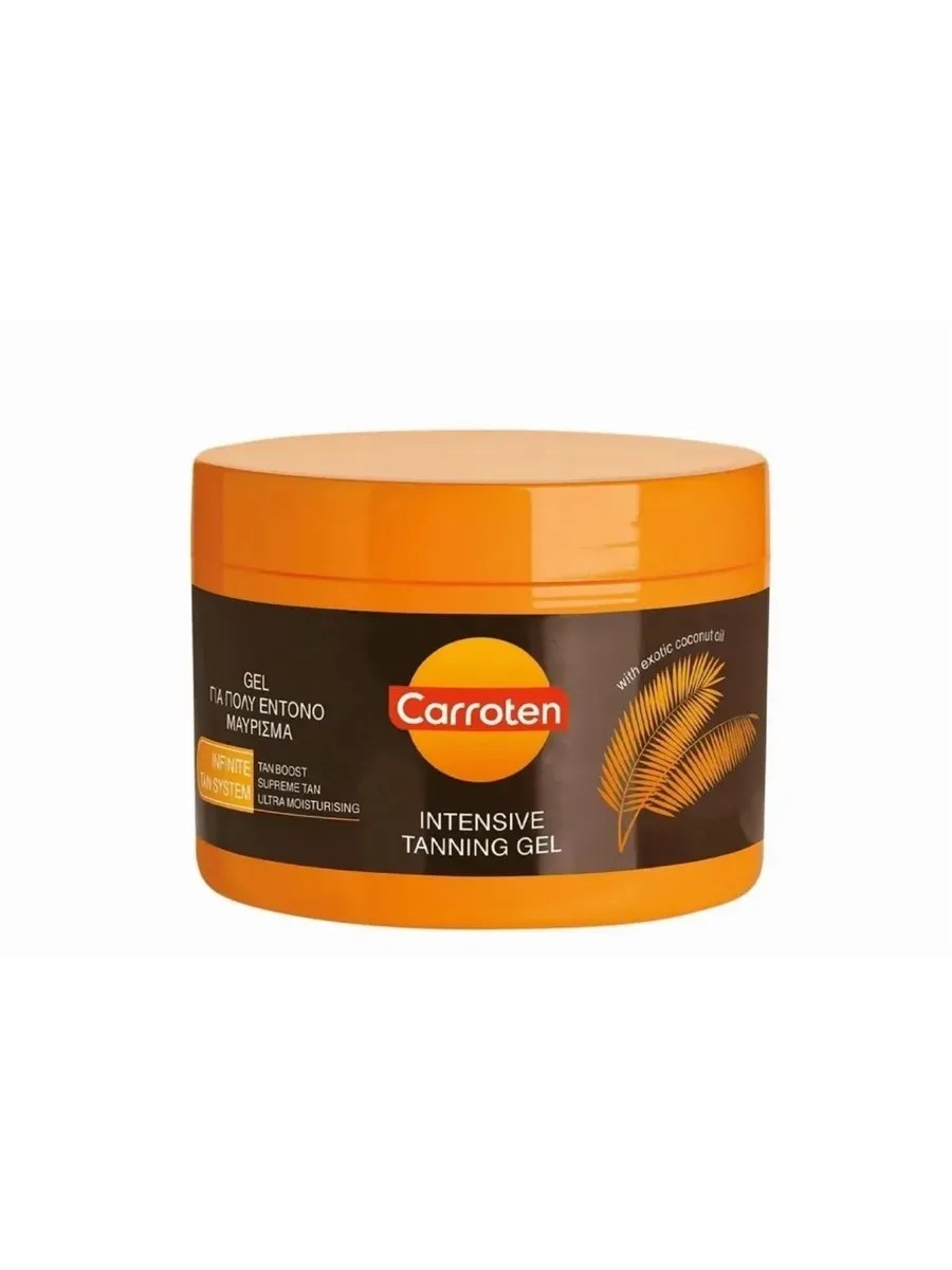 Гель для интенсивного загара Carroten Intensive Tanning Gel с кунжутным и кокосовым маслами, экстрактом календулы, провитамином А и витамином Е обеспечивает быстрый загар кожи.\n\nСостав способствует увлажнению, защищает от шелушения и продлевает время загара. Не содержит солнцезащитного крема.\n\n* Тип: Солнцезащитное средство\n* Бьюти-ингредиент: Растительный экстракт\n* Вид солнцезащитного средства: Гель\n* Тип кожи: Для всех типов кожи\n* Эффект: Питание\n* Применение: От солнца\n* Область использования: Лицо\n* Особенности состава: Проверено дерматологами\n* Целевая аудитория: Взрослая\n* Пол: Женский\n* Возрастной диапазон: от 18 лет\n* Единиц в одном товаре: 20\n* Объем: 150 мл\n* Вес: 150 г