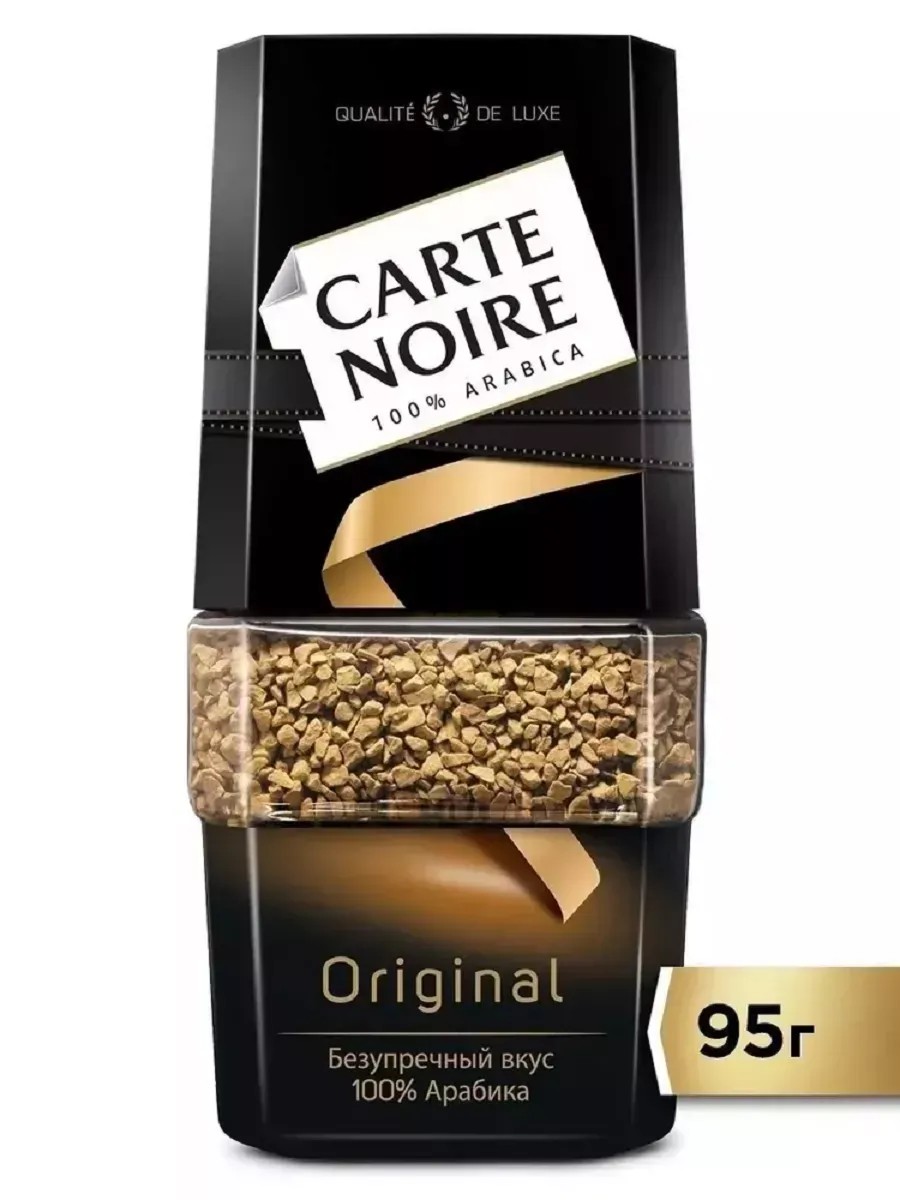 Carte Noire кофе растворимый Original стеклянная банка, 95 г. Кофе растворимый сублимированный Carte Noire 95 г — это очень известный премиальный напиток среди любителей растворимого кофе. Созданный из 100% арабики Exclusif высшего качества он достиг настоящего совершенства вкусовых характеристик. Секрет его безупречности в удивительной обжарке с использованием огня и льда. Холодный поток моментально останавливает обжарку в тот момент, когда она находится на самом пике. Встреча двух ярких контрастов рождает исключительный вкус растворимого кофе Carte Noire — насыщенный, дерзкий, сильный, ароматный. Впервые кофе Carte Noire был выпущен в 1978 году французским бизнесменом Рене Монье, а в России он появился более 15 лет назад, моментально завоевав уважение и популярность, оставаясь в линейке товаров постоянного спроса до сих пор. Высокое качество, тщательный контроль на кофейном производстве и только элитные сорта арабики — вот в чем залог успеха знаменитого кофе. Нельзя не оценивать и имидж благородного напитка. Изящная стеклянная банка нестандартной формы, как эталон красоты среди кофе. Она мгновенно привлекает внимание потребителя и надолго сохраняет первоначальные вкус и аромат. Кофе растворимый Carte Noire станет не только постоянным атрибутом вашей коллекции напитков, но и отличным подарком близким людям. Состав: 100% натуральный кофе.
