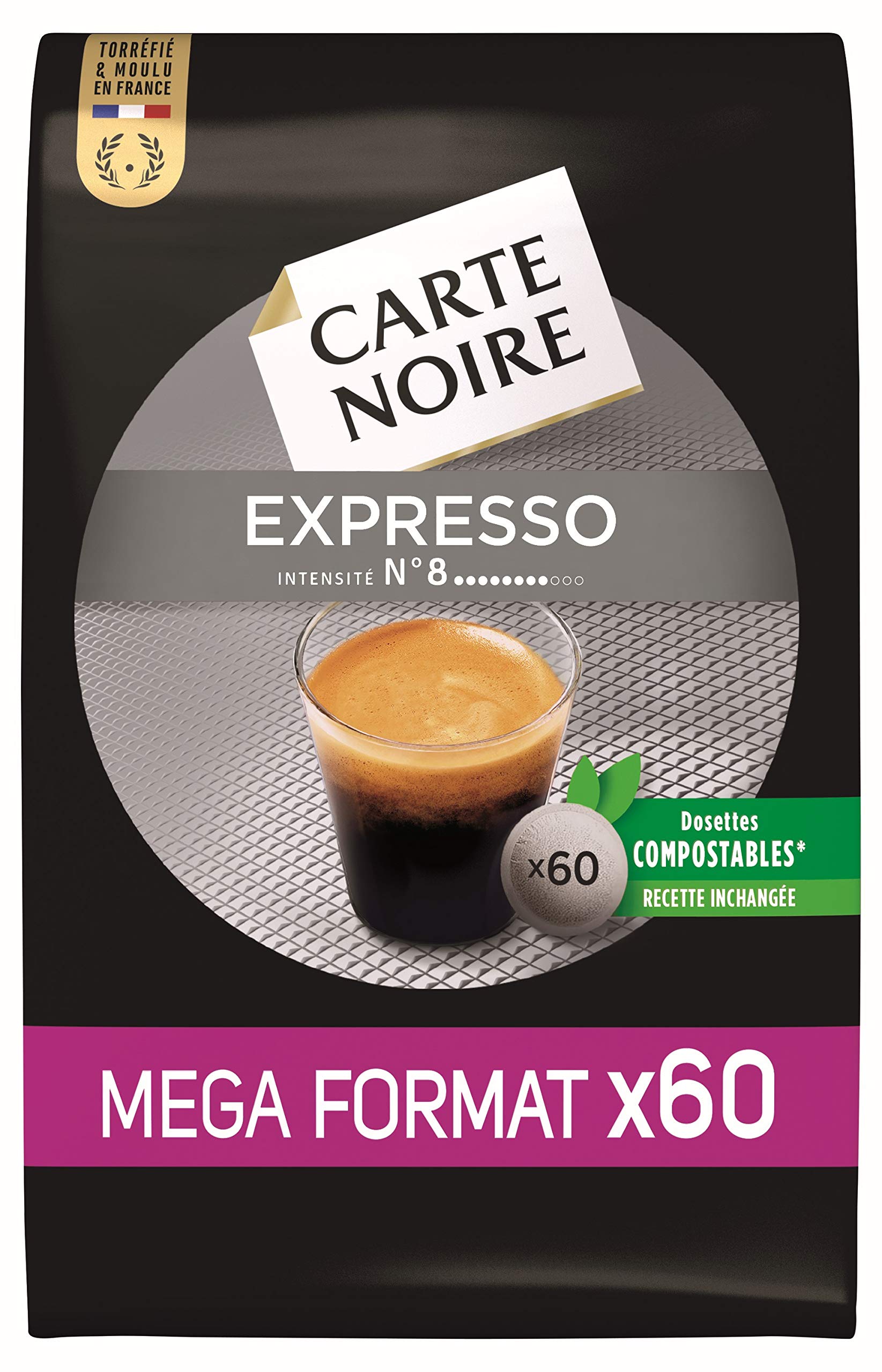 Carte Noire Coffee in Espresso N 8 pods: Ground roasted coffee in soft pure arabica pods with a perfectly balanced taste, for a moment of pleasure and sweetness. Rediscover the pleasure of a coffee with a perfectly balanced taste under a creamy, golden foam then let yourself be seduced by its powerful taste. Classic Expresso Coffee, delicate, sensory and rich in aromas. Roasted and ground in France, Intensity 8. Senseo compatible pods for perfect extraction for an unforgettable tasting moment, with all Carte Noire coffee quality. Pack of 60 ground coffee pods. For use with Senseo coffee machines. INGREDIENTS Ingredients: "60 pods of ground roasted coffee in individual soft pods. Packaged in a protective atmosphere." DIRECTIONS FOR USE "Compatible with your soft pod machine. To prepare a cup of Carte Noire coffee, place a pod at the bottom of your filter holder. Then press the 1 cup button. An environmentally friendly pod: 100 industrially compostable. Compostable pods certified EN 13432:2002 for industrial composting by TUV Austria. Remember to check the rules applicable to your community to check if sorting and composting organic waste is set up. Do not throw into the environment." SAFETY WARNING Store dry and away from heat. Pack of 60 ground coffee pods. For use with Senseo coffee machines. Senseo-compatible pods for perfect extraction for an unforgettable tasting moment, with all the Carte Noire coffee quality. Delicate, sensory, and richly aromatic Classic Espresso coffee. Roasted and ground in France, Intensity 8. Rediscover the pleasure of a perfectly balanced coffee flavor under a creamy, golden foam, then let yourself be seduced by its powerful flavor. Roasted and ground coffee in soft pure Arabica pods with a perfectly balanced flavor, for a moment of pleasure and sweetness. Carte Noire Café en dosette Expresso N 8 : Café torréfié moulu en dosettes souples pur arabica au goût parfaitement équilibré, pour un moment de plaisir et de douceur. Retrouvez le plaisir d'un café au goût parfaitement équilibré sous une mousse onctueuse et dorée puis laissez-vous séduire par son goût puissant. Café Expresso Classic délicat, sensoriel et riche en arômes. Torréfié et moulu en France, Intensité 8. Dosettes compatibles Senseo pour extraction parfaite pour un moment de dégustation inoubliable, avec toute la qualité café Carte Noire. Paquet de 60 dosettes de café moulu. A utiliser avec les machines à café Senseo. INGRÉDIENTS Ingrédients : "60 dosettes café torréfié moulu en dosettes individuelles souples. Conditionné sous atmosphère protectrice." MODE D'EMPLOI "Compatible avec votre machine à dosettes souples. Pour préparer une tasse de café Carte Noire, déposez une dosette au fond de votre porte-filtre. Puis appuyez sur le bouton 1 tasse. Une dosette respectueuse de l'environnement: 100 compostable industriellement. Dosettes compostables certifiées EN 13432:2002 pour le compostage industriel par TUV Austria. Pensez à vérifier les règles applicables à votre collectivité pour vérifier si le tri et le compostage des déchets organiques est mis en place. Ne pas jeter dans la nature." AVERTISSEMENT DE SÛRETÉ A conserver au sec et à l'abri de la chaleur. Paquet de 60 dosettes de café moulu. A utiliser avec les machines à café Senseo. Dosettes compatibles Senseo pour extraction parfaite pour un moment de dégustation inoubliable, avec toute la qualité café Carte Noire. Café Espresso Classic délicat, sensoriel et riche en arômes. Torréfié et moulu en France, Intensité 8. Retrouvez le plaisir d'un café au goût parfaitement équilibré sous une mousse onctueuse et dorée puis laissez-vous séduire par son goût puissant. Café torréfié moulu en dosettes souples pur arabica au goût parfaitement équilibré, pour un moment de plaisir et de douceur.