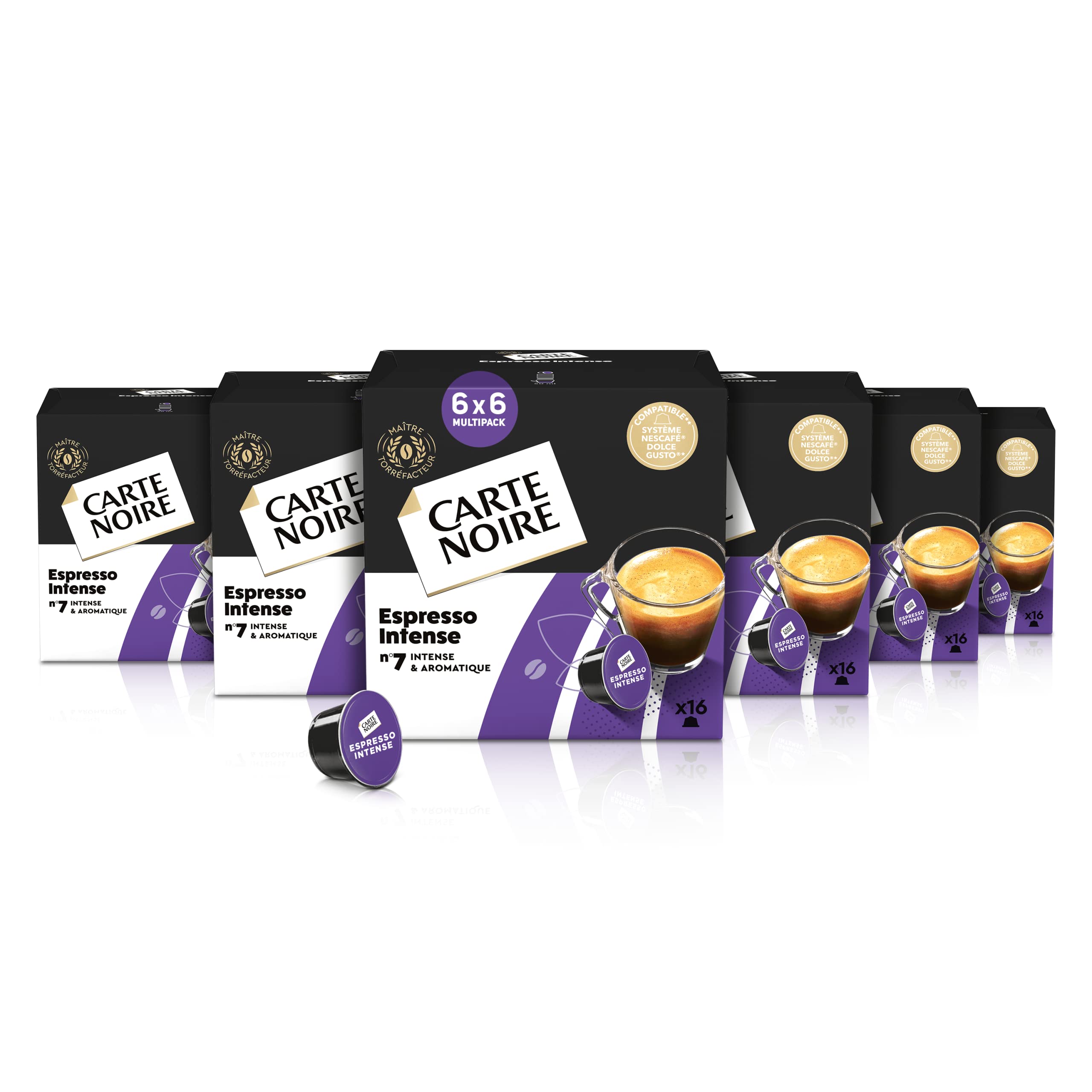 Espresso Intense is Carte Noire's roasted and ground coffee in pods, for an espresso with character and an intense taste. Capsules compatible with Nescafé Dolce Gusto machines. This coffee selection is characterized by subtle notes of hazelnut and cocoa, for an aromatic coffee. Passionate and expert, Carte Noire Master Roasters use all their know-how to reveal the best aromas of each coffee. Let yourself be surprised by a coffee with a powerful roast, for an intense and aromatic espresso. INGREDIENTS Ingredients: Roasted and ground coffee in capsules. 16 single-dose capsules, packaged in a protective atmosphere. Capsules cannot be sold individually. INSTRUCTIONS FOR USE Compatible with Nescafé Dolce Gusto system SAFETY WARNING Store in a dry place away from heat. CARTE NOIRE: Since 1978, Carte Noire has been driven by a passion for coffee, for over 40 years during which the brand has continued to innovate. INTENSITY: Let yourself be surprised by this powerfully roasted Carte Noire coffee, for an intense and aromatic espresso with an exceptionally delicious taste. BLEND: Passionate and expert, the Carte Noire Master Roasters use all their know-how to reveal the best aromas of each coffee. AROMATIC NOTES: Espresso Intense is a selection of coffee characterized by subtle notes of hazelnut and cocoa, for an aromatic and balanced coffee with an exceptional taste. ESPRESSO INTENSE: Carte Noire roasted ground coffee in pods, for an espresso with character and an intense taste. Capsules compatible with Nescafé Dolce Gusto machines. Espresso Intense est le café torréfié moulu de Carte Noire en dosettes, pour un espresso de caractère au goût intense. Capsules compatibles avec les machines Nescafé Dolce Gusto. Cette sélection de café est caractérisée par de subtiles notes de noisette et de cacao, pour un café aromatique. Passionnés et experts, les Maîtres Torréfacteurs Carte Noire mettent en œuvre tout leur savoir-faire pour révéler le meilleur des arômes de chaque café. Laissez-vous surprendre par un café à la torréfaction puissante, pour un espresso intense et aromatique. INGRÉDIENTS Ingrédients : Café torréfié moulu en capsules. 16 capsules monodoses, conditionnées sous atmosphère protectrice. Les capsules ne peuvent être vendues individuellement. MODE D'EMPLOI Compatible système Nescafé Dolce Gusto AVERTISSEMENT DE SÛRETÉ A conserver au sec et à l'abri de la chaleur. CARTE NOIRE: Depuis 1978, Carte Noire est animée par la passion du café, plus de 40 années durant lesquelles la marque n'a eu de cesse d'innover. INTENSITÉ: Laissez-vous surprendre par ce café Carte Noire à la torréfaction puissante, pour un espresso intense et aromatique, au goût exceptionnellement délicieux. ASSEMBLAGE: Passionnés et experts, les Maîtres Torréfacteurs Carte Noire mettent en œuvre tout leur savoir-faire pour révéler le meilleur des arômes de chaque café. NOTES AROMATIQUES: Espresso Intense est une sélection de café est caractérisée par de subtiles notes de noisette et de cacao, pour un café aromatique et équilibré, au goût exceptionnel. ESPRESSO INTENSE: Le café torréfié moulu de Carte Noire en dosettes, pour un espresso de caractère au goût intense. Capsules compatibles avec les machines Nescafé Dolce Gusto.