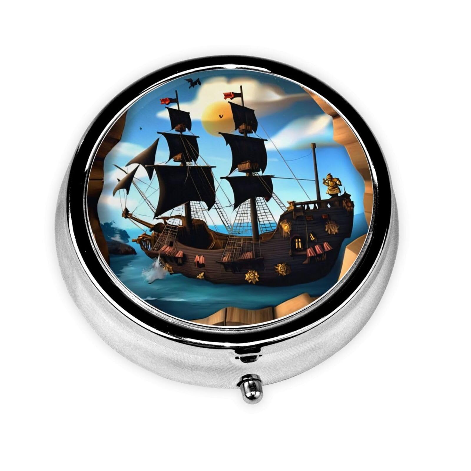 Wide range of applicable scenarios: suitable for use in various occasions such as home, office, and travel, providing you with convenient drug storage solutions. Multi-grid plastic inserts: The medicine box is designed with 3 plastic inserts inside, which can separate and store different types of pills, making them more organized and convenient to use. Convenient opening button design: The medicine box button design is easy to open, convenient and fast, and simple to operate, allowing you to easily access the medicine. Environmentally friendly metal material: Made of environmentally friendly metal iron plating material, it is durable, safe and reliable, and protects medicines from damage. Cartoon pirate ship Portable mini design: round mini pill box, measuring 2.0x2.0x0.7 inches, lightweight and portable, suitable for carrying in pockets and purses, providing you with urgently needed medicines anytime and anywhere.