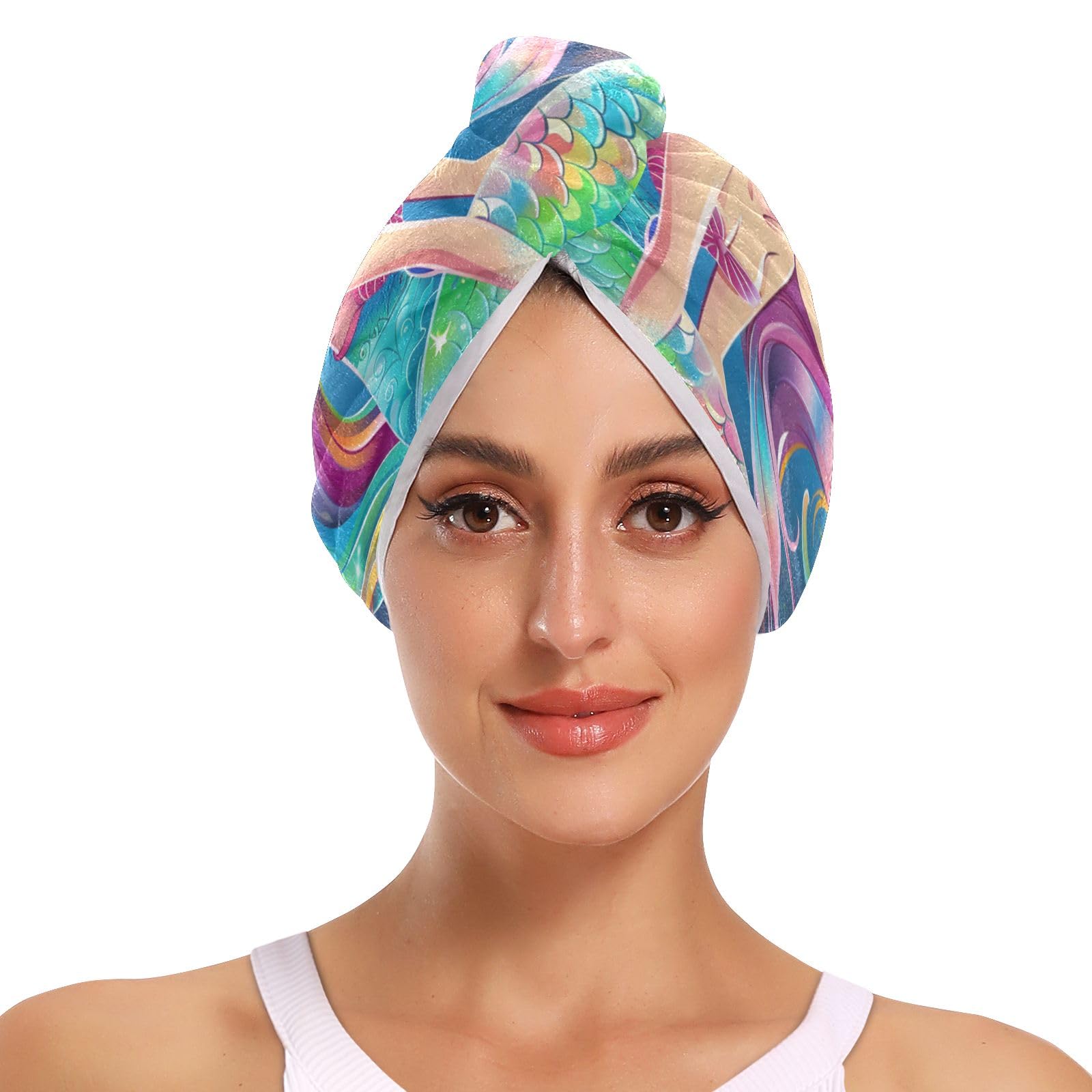 Cartoon Rainbow Mermaid Hair Towel 2 Pack Super Absorbent Hair Drying Towel Quick Dry Hair Turbans Head Towel with Button Twisty Wrap for Women Girls