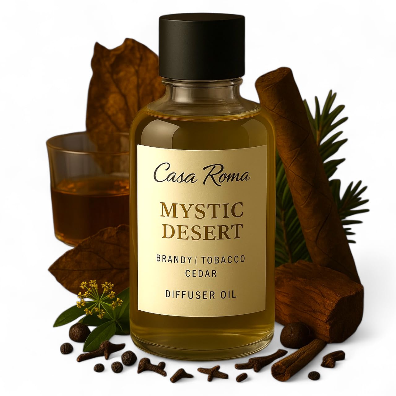 Step into the heat of the horizon with Mystic Desert by Casa Roma — a fragrance that unfolds like a mirage of spice and sun, suspended between memory and dream. This premium aroma oil blend opens with the richness of brandy, pepper, and davana, deepens into tobacco, clove, and fir, and lingers with the grounding embrace of cedar, patchouli, and guaiac. Crafted for waterless cold-air diffusion, Mystic Desert transforms your space with a clean, residue-free fragrance that endures. Each 120ml bottle is optimized for Casa Roma diffusers yet compatible with most waterless systems, delivering weeks of elevated scent. A warm and timeless blend, Mystic Desert turns every moment into a desert dream.Residue-Free Formula – Clean, waterless diffusion ensures pure aroma release without heat, mist, or dilution. Generous 120ml Bottle – Designed for extended use, each bottle provides weeks of consistent, even diffusion. Optimized for Cold-Air Diffusion – Specially formulated for Casa Roma diffusers but compatible with most waterless machines for a seamless fragrance experience. Balanced Fragrance Notes – Opens with Brandy, Pepper, and Davana, flows into Tobacco, Clove, and Fir, and settles into Cedar, Patchouli, and Guaiac. Premium Aroma Oil Blend – Mystic Desert by Casa Roma is crafted for waterless cold-air diffusers, offering a warm, spiced fragrance that evokes the desert's golden horizon.