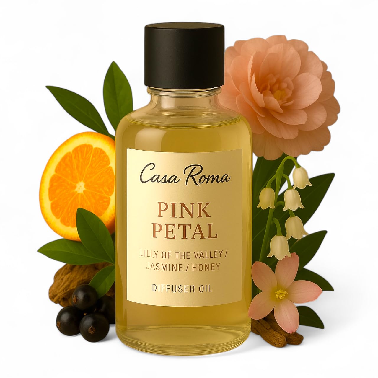 Soft and tender as a memory, Pink Petal by Casa Roma is a fragrance of fleeting beauty — a single blush petal falling on warm stone, unforgettable in its quiet grace. This premium aroma oil blend begins with the brightness of orange, yuzu, lemon, and blackcurrant, lifts into a floral heart of jasmine, tea, amber, and lily of the valley, and rests in the gentle embrace of honey, musk, and woods. Crafted for waterless cold-air diffusion, Pink Petal transforms any space with fragrance that is both delicate and enduring. Each 120ml bottle is optimized for Casa Roma diffusers yet compatible with most waterless systems, offering weeks of refined, residue-free aroma. Pink Petal is a whisper of warmth and tenderness — a fragrance that lingers in the heart as much as the air.Residue-Free Formula – Clean, waterless diffusion ensures pure aroma release without heat, mist, or dilution. Generous 120ml Bottle – Designed for extended use, each bottle provides weeks of consistent, even diffusion. Optimized for Cold-Air Diffusion – Specially formulated for Casa Roma diffusers but compatible with most waterless machines for a seamless fragrance experience. Balanced Fragrance Notes – Opens with Orange, Yuzu, Lemon, Blackcurrant, and Bitter Orange Leaf, softens into Jasmine, Tea, Amber, and Lily of the Valley, and settles into Honey, Musk, and Woods. Premium Aroma Oil Blend – Pink Petal by Casa Roma is crafted for waterless cold-air diffusers, offering a delicate yet lasting fragrance that blends citrus, florals, and honeyed warmth.