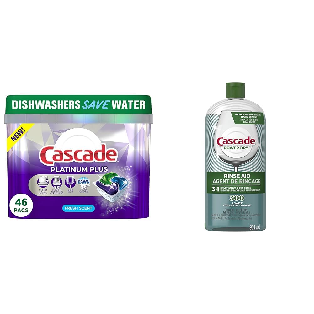 Cascade Dishwasher Detergent Pods, Platinum Plus ActionPacs, Fresh Scent, 46 Count Cascade Platinum Plus ActionPacs dishwasher detergent gives your dishes a breakthrough, cabinet ready clean. Loaded with 2X the Dawn grease fighting power, and 2X the food scrubbing power, it has soaking, scrubbing, and rinsing built right in. You can skip the pre-rinse, skip the soak, skip the scrub, and dare to dish differently. Just scrape your dishes and load them into your dishwasher with Platinum Plus to get a superior, sparkling clean, saving you time, effort, and energy vs handwashing. Get virtually spotfree gleaming glassware, dazzling dishes, and pristine pots and pans with Cascade Platinum Plus dishwashing ActionPacs. Cleaning ingredients vs. Cascade Complete ActionPacs. Cascade Dishwasher Rinse Aid, Power Dry, 901ML Cascade Power Dry Rinse Aid has three benefits in one product to Prevent Spots, Dry, Shine your dishes. Cascade Power Dry Rinse Aid delivers an Unbeatable Dry because its sheeting action helps prevent dish water from clinging to your dishes during your machine's rinse cycle so your dishes rinse cleaner, dry faster, and come out dry shining with virtually no water spots or streaks vs detergent alone. Plus, Cascade Power Dry Rinse Aid works great even in hard water. Cascade Power Dry Rinse Aid features an easy to pour cap to prevent spills and is easy to use. For best results, refill your dishwash with Cascade Power Dry Rinse Aid monthly. Cascade Power Dry Rinse Aid is recommended by Cascade Detergent. Cascade is the 1 Recommended Brand in North America More dishwasher brands in North America recommend Cascade vs. any other automatic dishwashing detergent brand, recommendations as part of co-marketing agreementsThe bundle includes 46 count Cascade Platinum Plus ActionPacs (Fresh Scent) and 901ml bottle of Cascade Power Dry Rinse Aid. The Cascade Power Dry Rinse Aid has an easy-to-pour cap to prevent spills and is recommended to be refilled monthly for best results. Running the dishwasher daily with Cascade products saves up to 45 liters of water compared to handwashing when using an ENERGY STAR certified dishwasher (uses 15 liters per cycle). Cascade Platinum Plus ActionPacs contain 40 larger liquid top for even more cleaning power that fits the dishwasher detergent dispenser, while the Cascade Power Dry Rinse Aid delivers 3-in-1 power by preventing spots, shining, and drying for a brilliant shine. Get sparkling clean and virtually spotfree dishes with this bundle that includes Cascade Platinum Plus ActionPacs (46 count, Fresh Scent) and Cascade Power Dry Rinse Aid (901ml) - the former provides 2X the grease fighting and scrubbing power vs Cascade Complete ActionPacs.