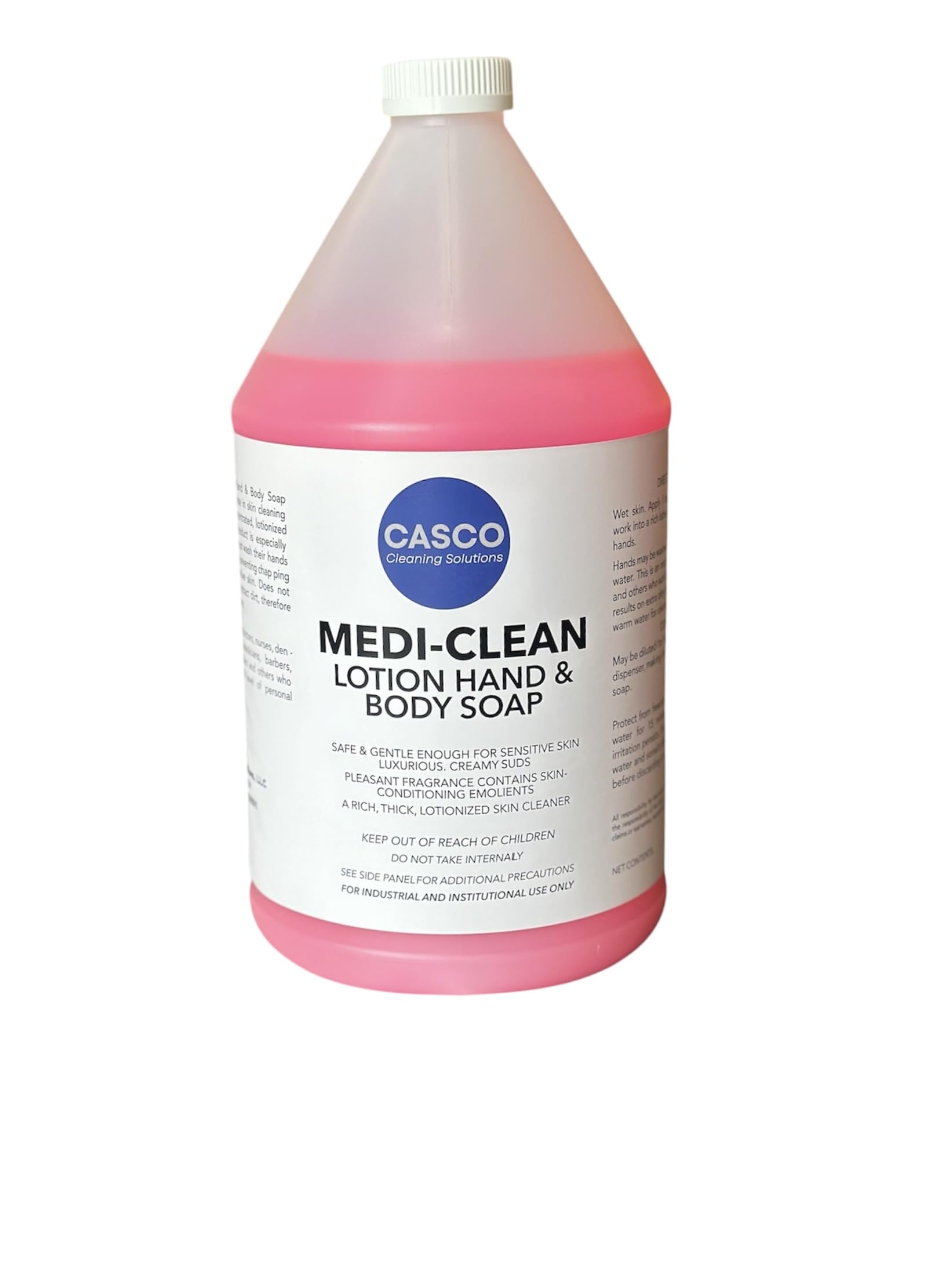 CASCO's Medi-Clean is a premium lotion hand and body soap designed for professionals who require frequent hand washing throughout their day. This concentrated formula creates luxurious, creamy suds while being gentle enough for sensitive skin. The rich, thick formula contains skin-conditioning emollients and features a pleasant fragrance. Perfect for use in institutional and industrial settings, this versatile soap can be used full-strength or diluted 1:1 with water for economical use in soap dispensers. Especially beneficial for mechanics, food handlers, beauticians, and others working with dirt and grime, this specialized formula prevents chapping and irritation while ensuring hands don't remain sticky. The concentrated formula makes it a cost-effective choice for high-volume usage areas. For optimal results, use with warm water for the most effective cleaning. Available in a convenient gallon size with easy-pour handle.