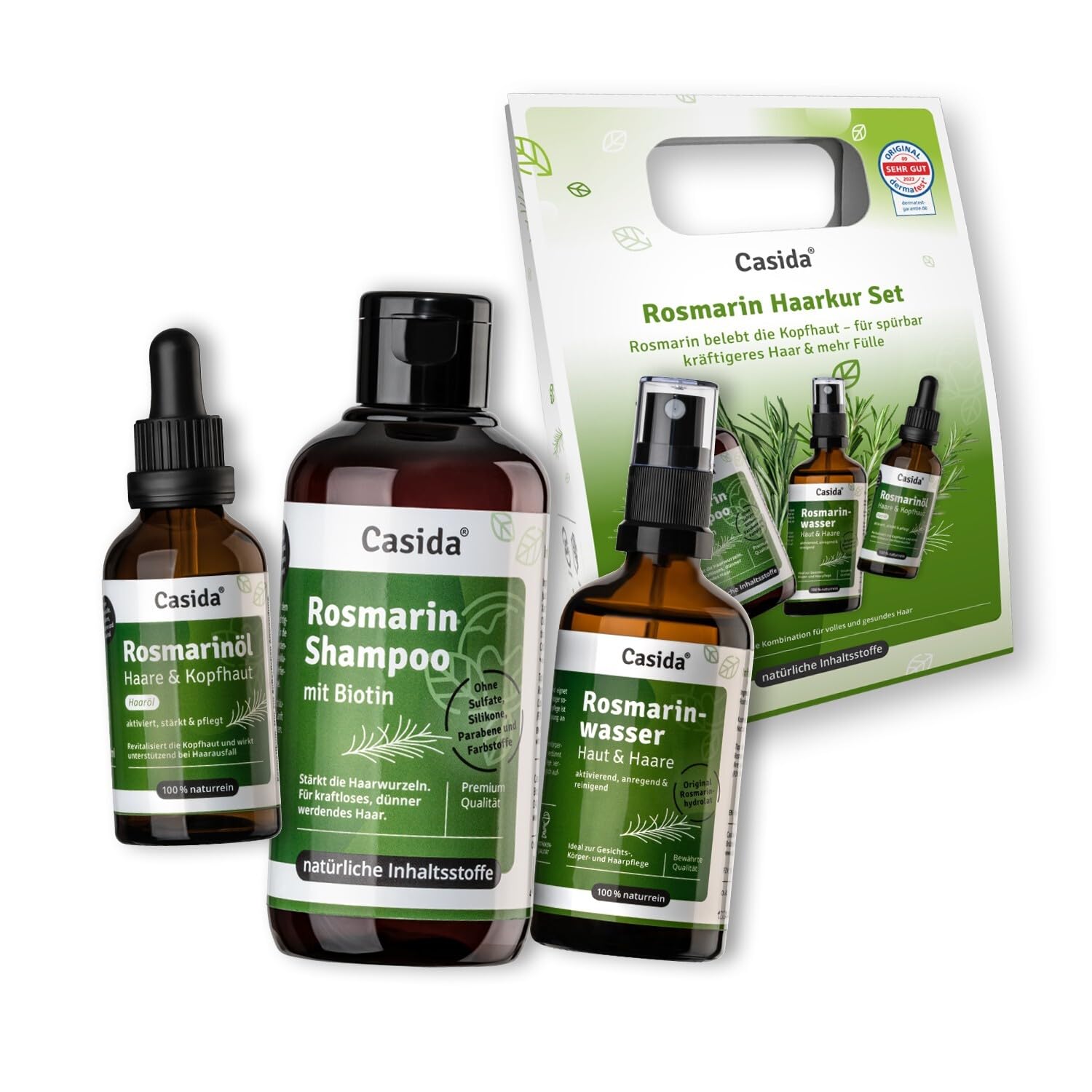 This unique hair treatment combines the power of three high-quality rosemary products to provide optimal nourishment and intensive care for both dry and oily hair. Experience the transformation of your hair into a beautiful, healthy, natural shine, without unwanted additives. INGREDIENTS Rosemary Oil: Caprylic Capric Triglycerides (Coconut Oil), Ricinus Communis Seed Oil, Prunus Amygdalus Dulcis Seed Oil, Triticum Vulgare Germ Oil, Rosmarinus Officinalis Leaf Oil, Mentha Piperita (Peppermint) Oil, Melaleuca Alternifolia (Tea Tree) Leaf Oil, Ocopherol, Limonene , Linalool [ natural components of the essential oil] DIRECTIONS 1. Apply the rosemary oil to the scalp and hair. 2. Massage into the scalp for better absorption. 3. Use rosemary water as a hair tonic after shampooing. 4. Apply rosemary shampoo to wet hair, massage, and rinse. SAFETY WARNING Store away from light and do not exceed 25 C. See morePharmaceutical quality from Germany: Our products are free of perfumes, mineral oils, silicones, parabens, PEGs, surfactants, and ingredients of animal origin. Suitable for all hair types: Whether your hair is normal, oily, or dry, our products are suitable for all hair types. Supports hair growth and scalp care. Rosmian Shampoo with Biotin (200 ml): Contains natural surfactants to gently cleanse the hair and rosemary, which stimulates scalp blood circulation and promotes hair growth. Nourishes the scalp and strengthens the hair structure for healthy, strong hair growth. Rosemary Water (100 ml): Soothing hair tonic – strengthens hair, stimulates hair growth, and nourishes the scalp in cases of dandruff and itchiness. It has a calming and clarifying effect on oily skin, impurities, and acne. Rosemary Hair Oil (50ml): With rosemary oil, mint oil, and tea tree oil effectively combined with rich castor oil, almond oil, and coconut oil. Specially formulated to promote hair growth and strengthen fine hair. It activates hair roots and intensely nourishes the scalp and hair.Casida Kit de Cure Capillaire au Romarin - Shampooing, Eau et Huile - Soin Optimal Avec des Ingrédients Naturels Contre la Chute des CheveuxDESCRIPTION DU PRODUIT DESCRIPTION DU PRODUIT Cette cure capillaire unique combine la puissance de trois produits de romarin de haute qualité pour fournir une nutrition optimale et un soin intensif aux cheveux secs et gras. Découvrez la transformation de vos cheveux en une brillance naturelle belle et saine, sans additifs indésirables. INGRÉDIENTS Huile de romarin : triglycérides de caprylic capric (huile de coco), huile de graines de ricinus communis, huile de graines de prunus amygdalus dulcis, huile de germe triticum vulgare, huile de feuille de romarinus officinalis, huile de mentha piperita (menthe poivrée), melaleuca alternifolia (arbre à thé). Huile de feuille, ocophérol, limonène , linalool [ composants naturels de l'huile essentielle] MODE D'EMPLOI [1. Appliquer l'huile de romarin sur le cuir chevelu et les cheveux. 2. Masser le cuir chevelu pour une meilleure absorption. 3. Utiliser l'eau de romarin comme tonique capillaire après le shampooing. 4. Appliquer le shampooing au romarin sur les cheveux mouillés, masser et rincer. ] AVERTISSEMENT DE SÉCURITÉ Conserver à l'abri de la lumière et ne pas dépasser 25 C. Voir plusQualité pharmaceutique d'Allemagne : nos produits sont exempts de parfums, huiles minérales, silicones, parabènes, PEG, tensioactifs et ingrédients d'origine animale. Convient à tous les types de cheveux : cheveux normaux, gras ou secs, nos produits conviennent à tous les types de cheveux. Soutient la croissance des cheveux et soin du cuir chevelu. Rosmian Shampooing avec biotine (200 ml) : contient des tensioactifs naturels pour nettoyer délicatement les cheveux et le romarin, qui stimule la circulation sanguine du cuir chevelu et favorise la croissance des cheveux. Nourrit le cuir chevelu et renforce la structure des cheveux, pour une croissance saine et forte des cheveux. Eau ROSMARIN (100 ml) : tonique apaisante pour cheveux – renforce les cheveux, stimule la croissance des cheveux et nourrit le cuir chevelu en cas de pellicules et de démangeaisons. Il a un effet calmant et clarifiant sur les peaux grasses, les impures et l'acné. HUILE ROSMARINO CHEVEUX CHEVEUX (50ml) : avec de l'huile de romarin, de l'huile de menthe et de l'huile d'arbre à thé efficacement combinées avec les huiles riches en huile de ricin, huile d'amande et huile de coco. Spécialement conçu pour favoriser la croissance des cheveux et renforcer les cheveux fins. Il active les racines des cheveux et nourrit intensément le cuir chevelu et les cheveux.