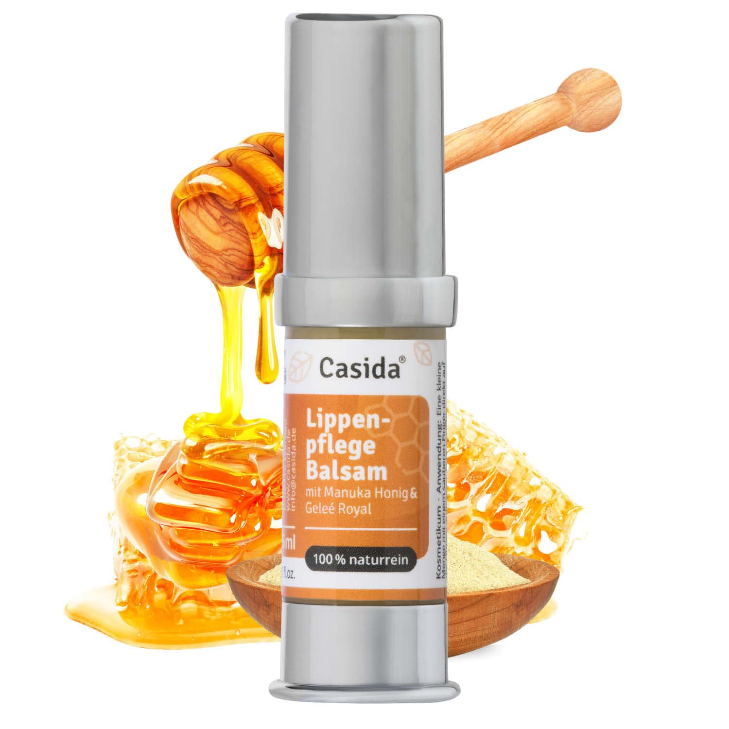 Care for brittle lips – very natural: the lip balm with Manuka Honey Royal Jelly intensively moisturizes, protects against dehydration and makes rough lips supple again. With shea butter, jojoba oil and natural bee honey, this balm is ideal for dry, cracked lips – without parabens, silicones or mineral oil. Perfect for daily lip care in winter or for sensitive skin. INGREDIENTS anoline – wool wax butyrospermum parkii butter – shea butter simmondsia chinensis seed oil – jojoba oil zinc oxides – zinc tocopherol – vitamin E Royal Jelly – Royal Helianthus Annuus seed oil – sunflower oil cera flava – yellow beeswax mel. Manuka honey Return inyl palmitate, vitamin A capric capric triglycerides, MCT oil, leptospermum, scoparium leaf oil, manuka oil, jasmine oil, limonene, benzyl acetate, benzyl salicylates, linalool, eugenol, natural ingredients INSTRUCTIONS FOR USE Apply a small amount directly to lips with a clean finger. SAFETY WARNING Before first use, warm the lip balm in the palm of your hand and activate it with repeated pumping. Store at room temperature and protect from cold and heat. Not suitable for use in case of allergy or hypersensitivity to bee products or any of the listed ingredients. See morePractical: lip care for daily use: ideal for sensitive lips - also suitable as a base under lipstick Universal honey lip balm - gentle care for the whole family. Protective: forms a natural protective film against cold, wind and dry air. Natural and pure: lip balm free from mineral oils, silicones, parabens and synthetic fragrances. Nourishing: lip balm enriched with shea butter and jojoba oil for soft, supple lips. Intensive: lip care with natural power. Provides lasting care for brittle and dry lips with manuka honey and royal jelly.Casida Lippenbalsem met manuka-honing en koninginnengelei, lippenbalsem voor droge, gebarsten lippen, 100 natuurlijk, veganistisch, 5 ml Verzorging voor broze lippen – heel natuurlijk: de lippenbalsem met Manuka Honing Royal gelei hydrateert intensief, beschermt tegen uitdroging en maakt ruwe lippen weer soepel. Met sheaboter, jojoba-olie en natuurlijke bijenhoning is deze balsem ideaal voor droge, gebarsten lippen – zonder parabenen, siliconen of minerale olie. Perfect voor de dagelijkse lippenverzorging in de winter of bij gevoelige huid. INGREDIËNTEN anoline – wolwas butyrospermum parkii boter – sheaboter simmondsia chinensis zaadolie – jojoba-olie zinkoxiden – zink tocoferol – vitamine E Royal Jelly – Royal Helianthus Annuus zaadolie – zonnebloemolie cera flava – gele bijenwas mel. Manukahoning Return inyl palmitaat, vitamine A capric capric triglyceriden, MCT-olie, leptospermum, scoparium bladolie, manukaolie, jasmijnolie, limoneen, benzyl-acetaat, benzylsalicylaten, linalool, eugenol, natuurlijke bestanddelen GEBRUIKSAANWIJZING Breng een kleine hoeveelheid met een schone vinger rechtstreeks op de lippen aan. VEILIGHEIDSWAARSCHUWING Voor het eerste gebruik de lippenbalsem in de handpalm verwarmen en met herhaaldelijk oppompen activeren. Bewaren op kamertemperatuur en beschermen tegen kou en hitte. Niet geschikt voor gebruik bij allergie of overgevoeligheid van bijenproducten of een van de vermelde ingrediënten. Meer bekijkenPraktisch: lippenverzorging voor dagelijks gebruik: ideaal voor gevoelige lippen – ook geschikt als basis onder lippenstift Universele honinglippenbalsem – zachte verzorging voor het hele gezin. Beschermend: vormt een natuurlijke beschermende film tegen kou, wind en droge lucht. Natuurlijk en zuiver: lippenbalsem vrij van minerale oliën, siliconen, parabenen en synthetische geurstoffen. Voedend: lippenbalsem verrijkt met sheaboter en jojoba-olie voor zachte, soepele lippen. Intensief: lippenverzorging met natuurlijke kracht. Verzorgt broze en droge lippen duurzaam met manuka-honing en koninginnengelei.