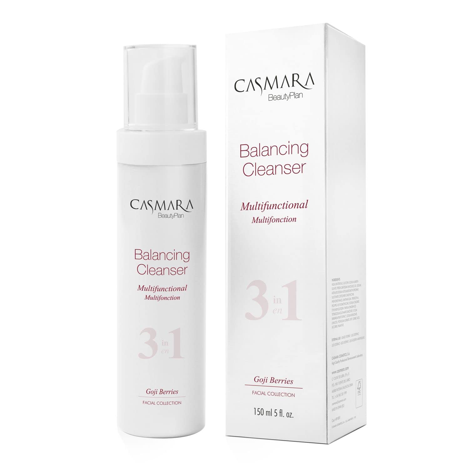 Dear Customers! To your attention here is an excellent CASMARA CLEANSER BALANCING 150 ml made by professional cosmetics brand Casmara, Cosmetics S. A. from Spain (Valencia). This is a unique emollient and balancing cleanser based on Goji berries (Lycium barbarum). It has a light liquid texture suitable for all skin types. This cleanser has an optimal combination of natural active ingredients especially Goji berry extract, the super fruit of the Himalayas, which gives unique antioxidant properties, helping to combat and prevent the signs of ageing. The Goji Berry extract neutralizes the negative effects of free radicals and reactivates cellular metabolism through its antioxidant power. 3 in 1 multi-purpose: Cleanser, toner and make-up remover, in just one step. Including the eye contour. Active ingredients: GOJI BERRY EXTRACT: Antioxidant. Prevent the signs of ageing. AVOCADO OIL: Natural oil. Emollient and protective actions. Application: Apply directly to the damp face, massage gently and rinse off with plenty of lukewarm water. For eyes make-up removal use a damp cotton pad soaked with the product, then rinse with water. Size: 150 ml