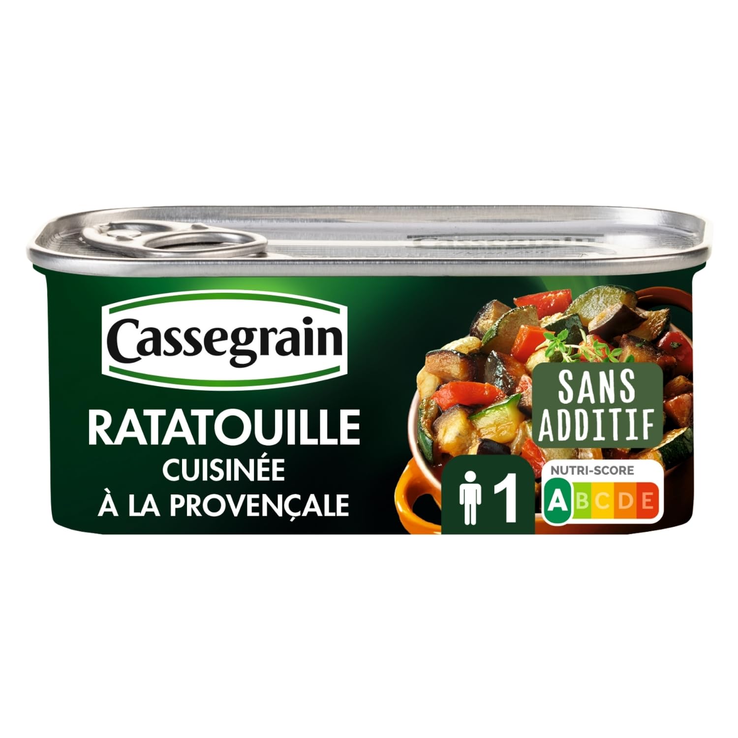 : Cassegrain allows the French to enjoy the best of plant-based food every day. Closely attuned to your needs, committed to saving you time, and dedicated to fulfilling your plant-based eating aspirations, our products are the result of a perfect blend of carefully selected ingredients and renowned expertise. Cassegrain enables everyone to effortlessly transform everyday meals into extraordinary moments with its canned vegetables and prepared salads. Cassegrain's Provençal-style ratatouille offers a flavorful mix of sun-ripened vegetables, enhanced with extra virgin olive oil and a hint of thyme. Convenient and delicious, it adds a Mediterranean touch to your meals. Ready to eat, it can be enjoyed hot with pasta, rice, couscous, or cold in a salad or on toast. Ingredients: Pre-fried diced eggplant 25 (eggplant 22 , sunflower oil), diced courgettes 25 , semi-reduced tomato puree 21 , diced onions 13 , diced red peppers 8 , double concentrated tomato paste 3 , extra virgin olive oil 1.5 , sugar 1.3 , salt, garlic, concentrated lemon juice, WHEAT flour, thyme 0.1 .SERVING IDEAS: Gently warm our ratatouille and stir it into your pasta dish or enjoy it on a slice of fresh cheese. Hot or cold, it's a treat! SUSTAINABLE COMMITMENT: We are committed to the environment by growing our vegetables seasonally and in the most suitable growing regions. We collaborate with farmers renowned for their expertise! SIMPLE RECIPE WITH NO ADDITIVES: Our canned ratatouille is simmered with a drizzle of extra virgin olive oil and a hint of thyme. DELICIOUS SUN-DRIED VEGETABLES: Beautiful pieces of tender, colorful vegetables, simmered in a smooth sauce. That's the secret to our ratatouille. PROVENCAL-STYLE RATATOUILLE: Enjoy our delicious canned Cassegrain ratatouille. We've cooked the best sun-ripened vegetables for you in our cauldrons.Description du produit Cassegrain permet aux Français de se faire plaisir au quotidien avec le meilleur du végétal. Proches de vos attentes, soucieuses de vous faire gagner du temps, mais aussi de répondre à vos aspirations en matière de consommation végétale, nos propositions sont le résultat d'une belle alchimie entre des ingrédients soigneusement sélectionnés et un savoir-faire reconnu. Ainsi, Cassegrain permet à chacun de transformer, jour après jour et sans effort, des plats ordinaires en moments extraordinaires, avec ses conserves de légumes et ses salades traiteur. La ratatouille cuisinée à la provençale Cassegrain offre un mélange savoureux de légumes du soleil, agrémentés d'huile d'olive vierge et d'une note de thym. Pratique et délicieuse, elle apporte une touche méditerranéenne à vos plats. Prête à être dégustée, elle peut être consommée chaude avec des pâtes, du riz, de la semoule. ou froide dans une salade composée ou sur une tartine. Ingrédients Dés d'aubergines préfrites 25 (aubergines 22 , huile de tournesol), dès de courgettes 25 , purée de tomates mi-réduite 21 , oignons en dès 13 , poivrons rouges en dès 8 , double concentré de tomate 3 , huile d'olive vierge extra 1,5 , sucre 1,3 , sel, ail, jus concentré de citron, farine de BLE, thym 0.1 .IDEES DE DEGUSTATION : Réchauffez notre ratatouille à feu doux et incorporez-la à votre assiette de pâtes ou savourez-la sur une tartine de fromage frais. Chaude ou froide, c'est un régal !. ENGAGEMENT DURABLE : Nous nous engageons pour l'environnement en cultivant nos légumes en saison et dans les terroirs les plus adaptés. Nous collaborons avec des agriculteurs au savoir-faire reconnu !. RECETTE SIMPLE SANS ADDITIF : Notre ratatouille en conserve est compotée avec un trait d'huile d'olive vierge extra et une note de thym. LEGUMES DU SOLEIL GOURMANDS : De beaux morceaux de légumes fondants et colorés, compotés dans une sauce onctueuse. C'est le secret de notre ratatouille. RATATOUILLE A LA PROVENCALE : Dégustez notre délicieuse ratatouille Cassegrain en conserve. Nous avons cuisiné pour vous les meilleurs légumes du soleil dans nos chaudrons.CASSEGRAIN - Ratatouille Cuisinée à la Provençale - Légumes du Soleil, Huile d'Olive Vierge Extra 1,5 , Thym - Sans Additif - Nutri-Score A - Emballage 100 Recyclable - 185 g 185 g (Lot de 1) 185.0