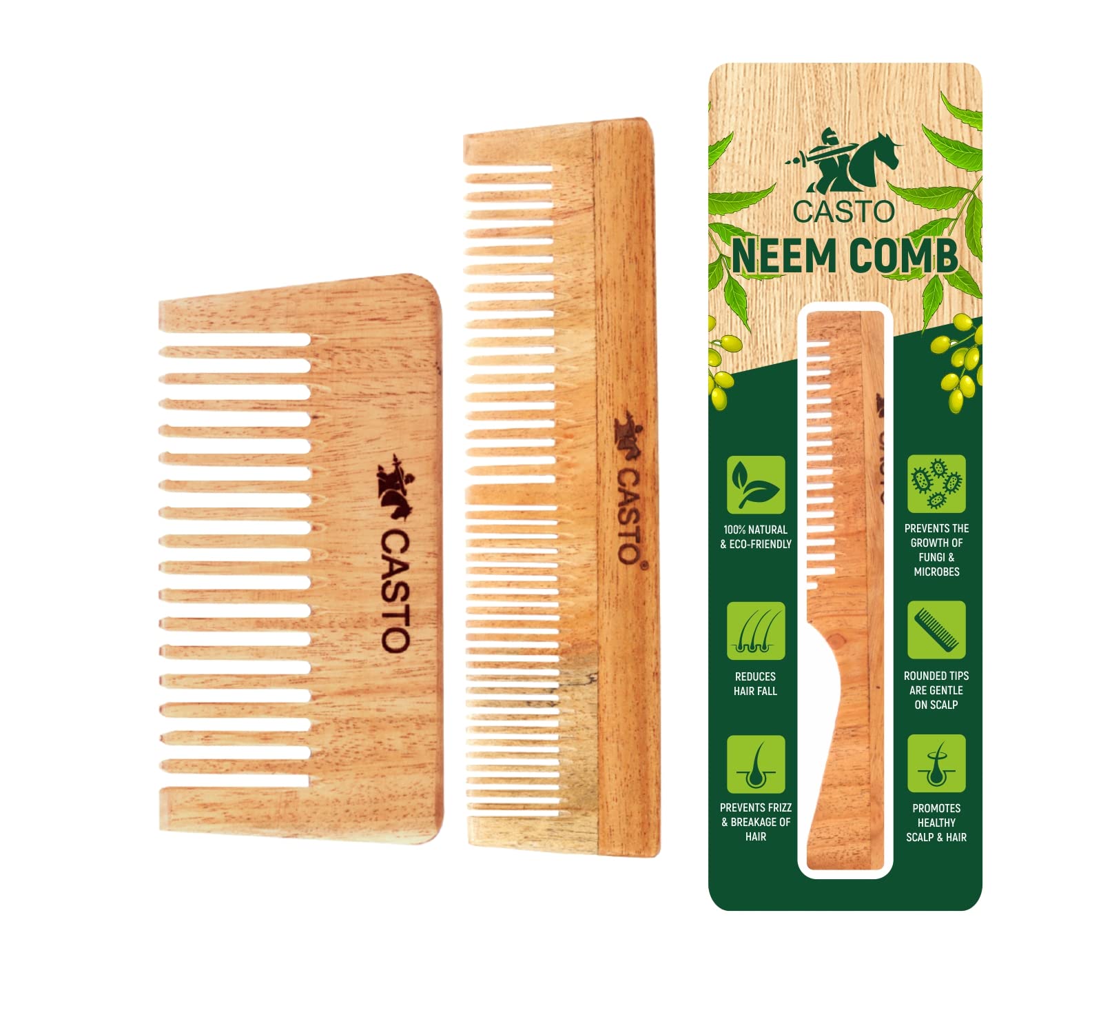 CASTO Organic Pure Neem Handmade Neem Wood Comb for Men and Women Pack of 2 (Neem Comb + C)