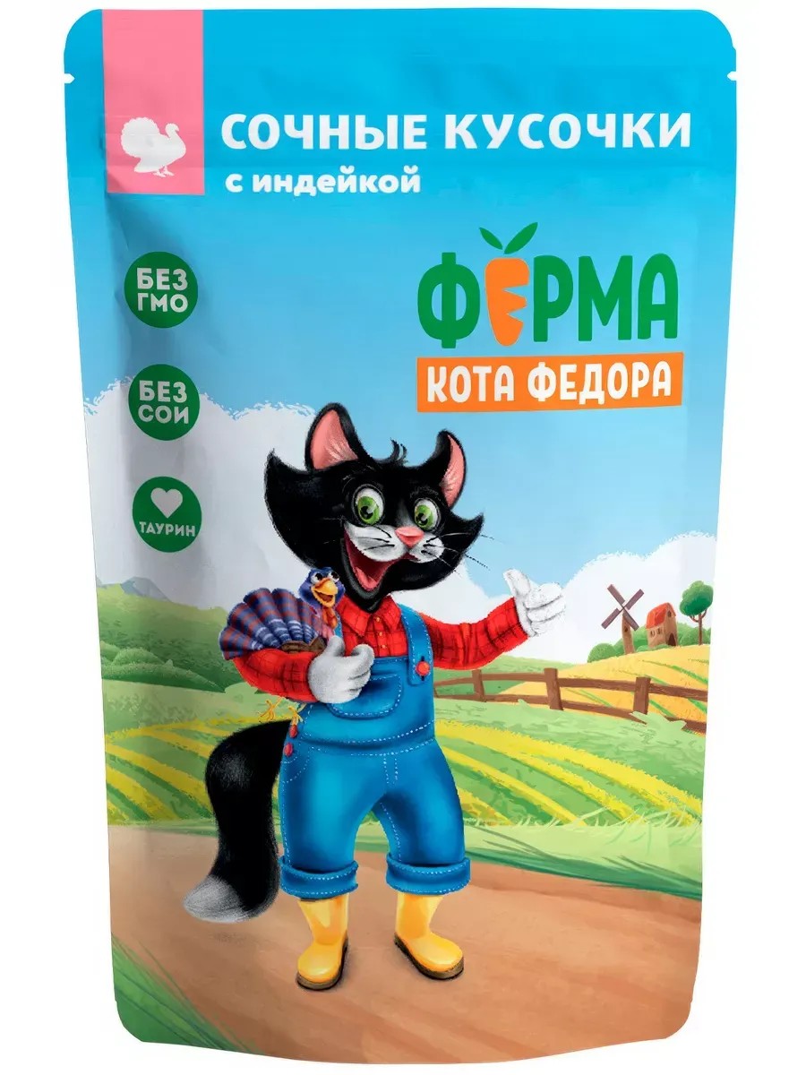 Корм Ферма кота Фёдора (в желе) для кошек, индейка, 85 г x 24 шт. Корм Ферма кота Фёдора (в желе) для кошек, индейка, 85 г Влажный корм с Фермы кота Фёдора - это сбалансированный рацион, который обязательно понравится вашей кошке. Насыщенный вкус индейки в желе порадует как активного исследователя, так и домоседа, и позволит почувствовать себя настоящим фермерским жителем. В корме 36% Мясных ингредиентов, а еще.. . Нет ГМО, сои, консервантов, ароматизаторов, усилителей вкуса и искусственных красителей. Кот Фёдор рекомендует! Состав: мясо и мясные субпродукты не менее 36% (индейка 12%), злаки, витамины и минеральные вещества. Энергетическая ценность (калорийность) на 100 г: 81 ккал/339 кДж. Питательная ценность на 100 г продукта (средние значения) : белки 8%, жиры 4%, зола 1,6%, клетчатка 0,4%, влага 82%. Питательные добавки: витамин А 1500 МЕ/кг, витамин D3 100 МЕ/кг, витамин Е 7 МЕ/кг, цинк 22 мг/кг, марганец 2 мг/кг, таурин 600 мг/кг. Ингредиенты: мясо и мясные субпродукты не менее 36% (индейка 12%), злаки, витамины и минеральные вещества. Энергетическая ценность (калорийность) на 100 г: 81 ккал/339 кДж. Суточная норма: Взрослым кошкам среднего веса (4 кг) с нормальной активностью давать 3-4 упаковки в день. Ваша кошка может съедать больше или меньше рекомендуемых количеств корма в день в зависимости от возраста, темперамента и активности. У животного всегда должен быть доступ к питьевой воде.