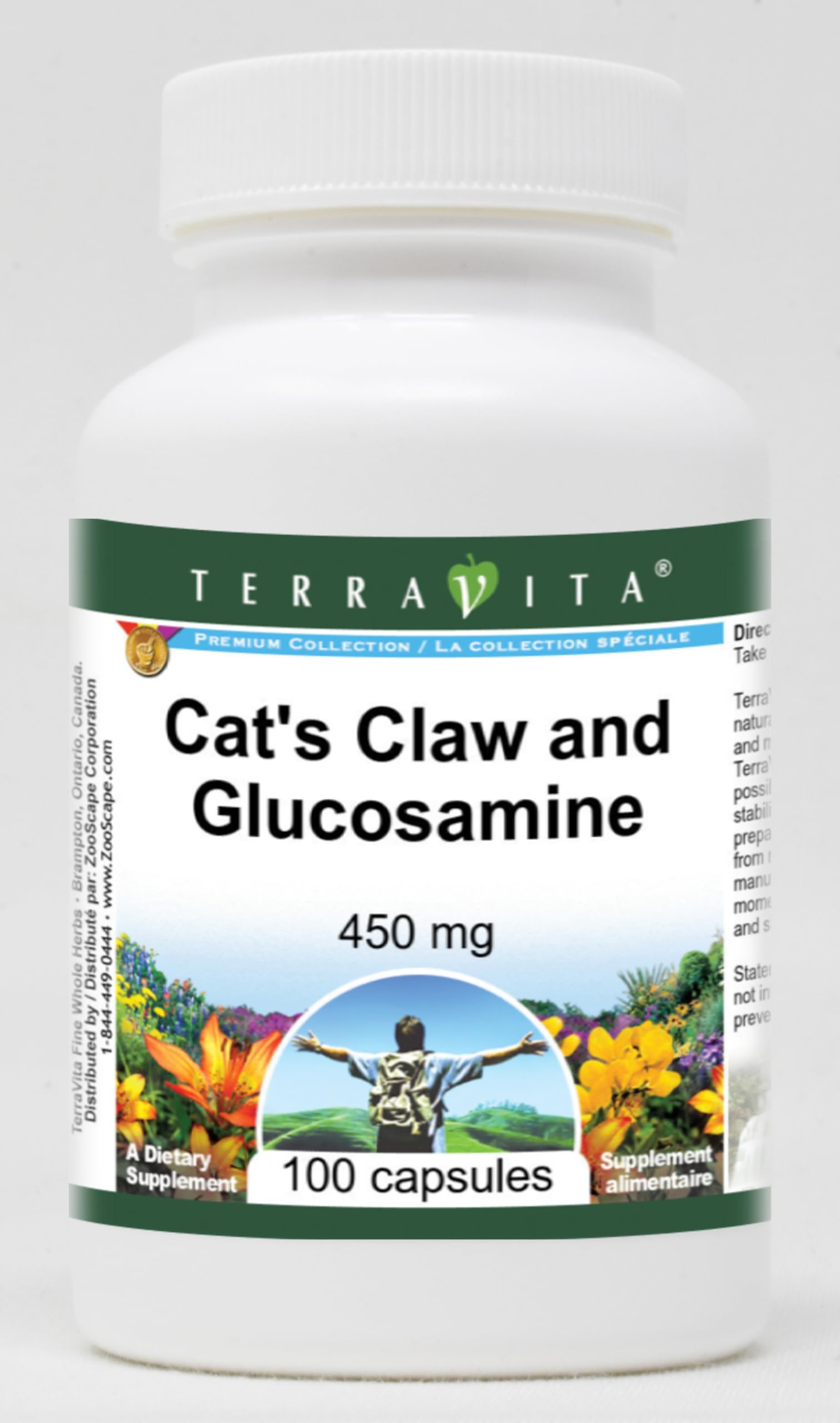 Cat's Claw and Glucosamine - 450 mg (100 capsules, ZIN: 511964) Packaged in the United States in a GMP certified facility (Good Manufacturing Practice). No fillers. Manufacturer: TerraVita Size: 100 capsules Easy-to-swallow Capsules in a sealed bottle. Ingredients: Gelatin, Water, Cat's Claw Bark (Una de Gato Vine) - 225 mg, Glucosamine Sulfate - 225 mg