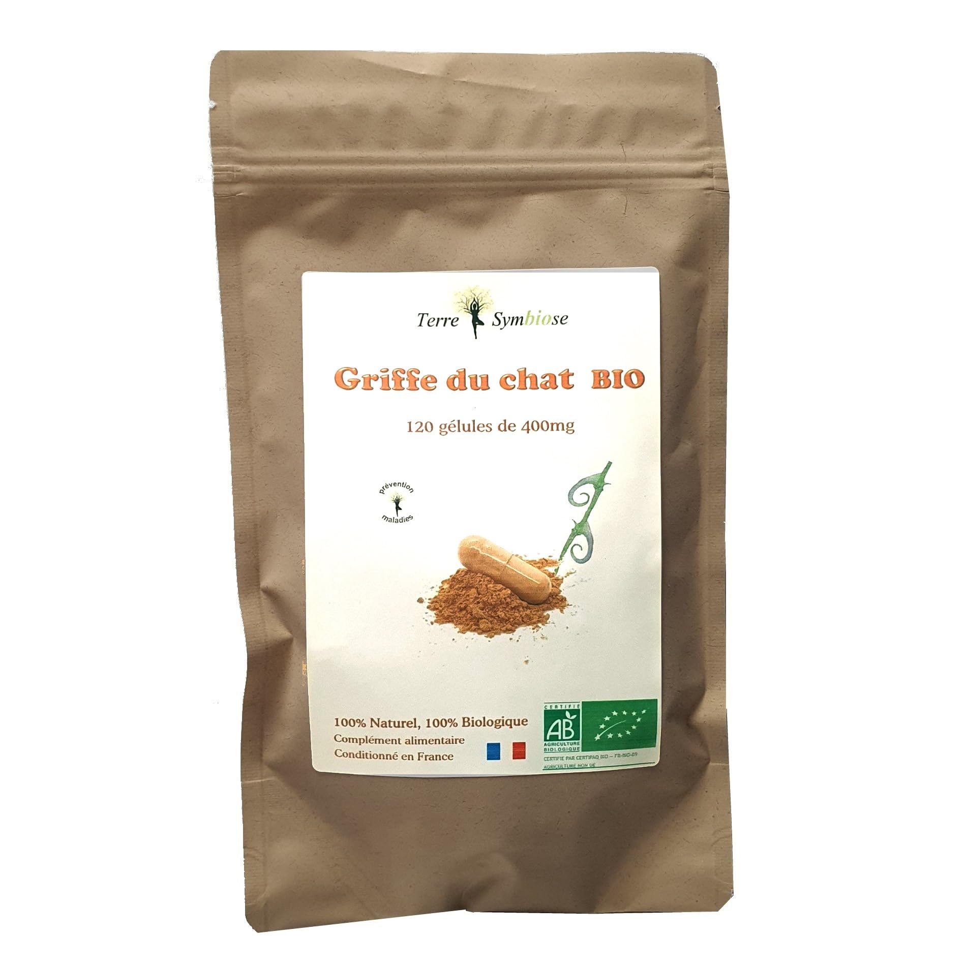 Organic Cat's Griffe No additives and 100 Natural Characteristics: Bag of 120 capsules of 400mg, net weight 61.20. Composition: Organic Cat's Claw Bark Powder - Uncaria Tomentosa, Vegan vegetable capsule, Origin Peru - . Product from non-EU organic farming. Certified by FR-BIO-09. Packaged in France in our workshop. What is Cat's Claw? Cat's Claw, also called "Uncaria tomentosa", is a vine native to the ian forest of Peru, which can measure more than 20 meters and have a diameter of up to 20 cm. It gets its name from the fact that it has large curved thorns used to cling to other plants. It is from its bark reduced to a powder state that Native Americans use this "Sacred" plant to relieve inflammatory pain or stimulate the immune system. Benefits of Cat's Claw The rich chemical composition of the bark of Uncaria tomentosa composed essentially of Quininic derivatives, Alkaloids, Tannins, Terpedes and many other components with various properties give it a strong anti-inflammatory power and a great capacity to increase immunity to fight infections. INGREDIENTS Organic Cat's Claw Powder, Vegetable Capsule DIRECTIONS FOR USE 1 to 3 capsules per day to be distributed during meals. SAFETY WARNING Before consumption, talk to your doctor if you have a health problem, are pregnant, or breastfeeding or if you have any adverse reactions. Consumption not recommended in case of medicinal treatment. Store in a cool, dark, dry place. This food supplement should not be used to replace a varied diet. Not recommended for children and reserved for adults. Do not exceed the recommended dose. Keep out of reach of young children. Stimulates the immune system. Relieves rheumatic pain. Griffe du Chat Biologique Sans additif et 100 Naturel Caractéristiques : Sachet de 120 gélules de 400mg, poids net 61,20. Composition : Poudre d'écorce de Griffe du chat biologique - Uncaria Tomentosa, gélule végétale Vegan, Origine Pérou - ie. Produit issu de l'agriculture biologique non-UE. Certifié par FR-BIO-09. Conditionné en France dans notre atelier. Qu'est-ce que la Griffe du chat ? La Griffe du chat aussi appelée "Uncaria tomentosa" est une liane originaire de la forêt ienne du Pérou, pouvant mesurer plus de 20 mètres et d'un diamètre allant jusqu'à 20 cm. Elle tient son nom du fait qu'elle soit munie de grosses épines recourbées lui servant à s'accrocher à d'autres végétaux. C'est à partir de son écorce réduite à l'état de poudre que les Amérindiens utilisent cette plante "Sacrée" pour soulager les douleurs inflammatoires ou stimuler le système immunitaire. Bienfaits de la Griffe de chat La richesse de la composition chimique de l'écorce d'Uncaria tomentosa composée essentiellement de dérivés Quininiques, d'Alcaloïdes, de Tanins, de Terpèdes et de nombreux autres composants aux propriétés diverses lui confèrent un fort pouvoir anti-inflammatoire et une grande capacité à augmenter son immunité pour combattre les infections. INGRÉDIENTS Poudre de Griffe du Chat Biologique, Gélule végétale MODE D'EMPLOI 1 à 3 gélules par jour à répartir durant les repas. AVERTISSEMENT DE SÛRETÉ Avant sa consommation, parlez-en à votre médecin si vous avez un problème de santé, êtes enceinte, ou allaitez ou si vous avez des réactions indésirables. Consommation déconseillée en cas de traitement médicamenteux. A conserver dans un endroit frais, sombre et sec. Ce complément alimentaire ne doit pas être utilisé pour remplacer un régime varié. Déconseillé aux enfants et réservé aux adultes. Ne pas dépasser la dose recommandée. Tenir hors de portée des jeunes enfants. Stimule le système immunitaire. Soulage les douleurs rhumatismales.