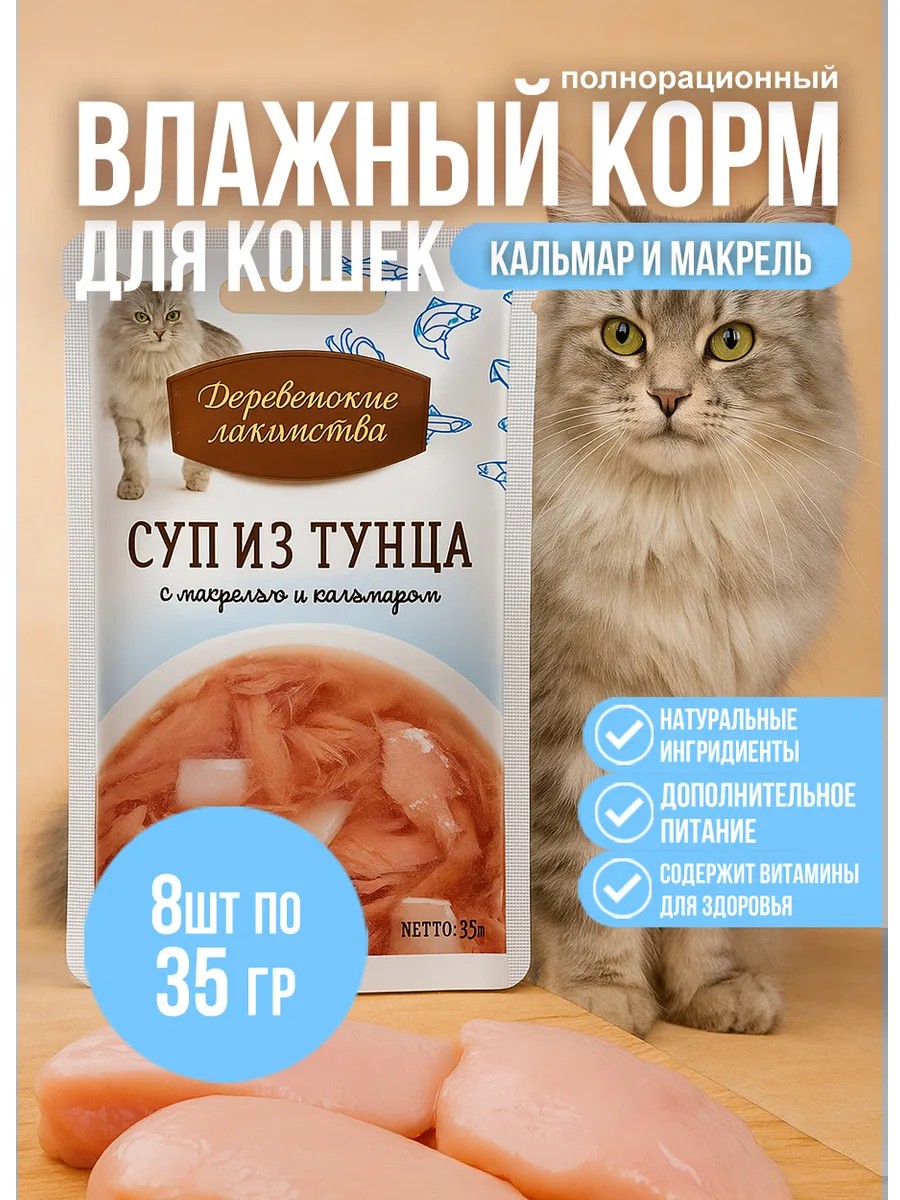 Natural cat soup with tuna, squid, and mackerel from Derevenskie Delicacies is the ideal solution for caring owners seeking tasty and nutritious nutrition for their pets.