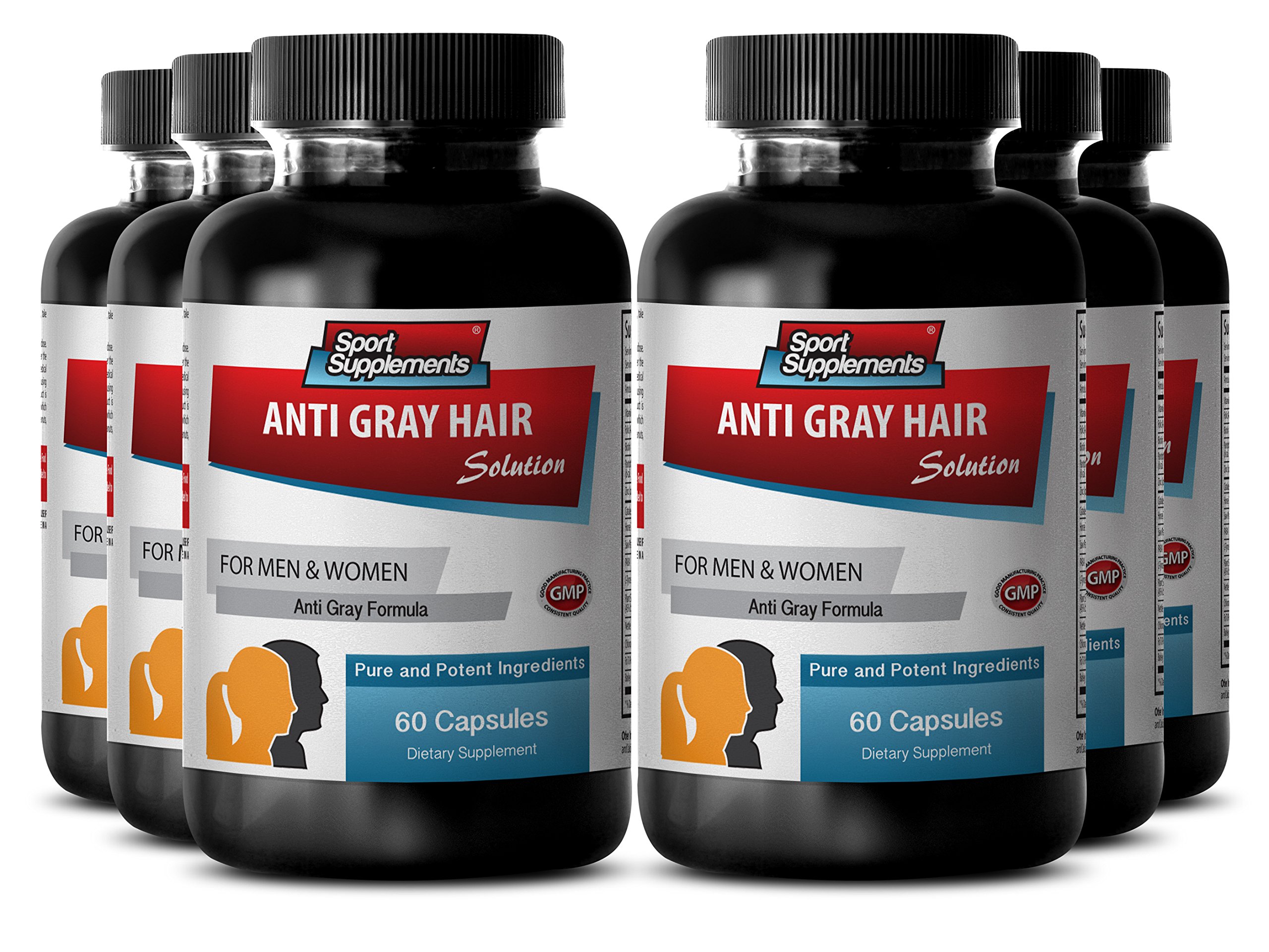 Catalase supplement - Anti Gray Hair - Gray hair catalase (6 Bottles - 360 Capsules) Anti-Gray Unique and Premium Formula - This one of a kind Natural formula may help you to restore hair color and prevent hair follicles from loosing melanin enzyme. Works for women and men and effective for all hair types. Hair on our heads - is made up of two parts: first, a shaft — the colored part we see growing out of our heads. Second, a root — the bottom part, which keeps the hair anchored under the scalp. Why Does Hair Turn Gray? - As we get older, the pigment cells (melanin) in our hair follicles gradually die. When there are fewer pigment cells in our hair follicle becomes gray, silver, or white — as it grows. As people continue to get older, fewer pigment cells will be around to produce melanin. Eventually, the hair will look completely gray. Saw Palmetto's - effects on hormone metabolism may have important implications for hormone restoration programs as well as for supporting healthy hair growth and preventing hair loss. Nettle Root - helps maintain natural look and it is said to be a remedy against oily hair and dandruff. Works for women and men and effective for all hair types. Nettle Root properties support health of hair follicles and helps maintain hair growth. PABA as an Anti-Gray Hair Vitamin - this versatile substance has a potential to restore hair to its natural color. Studies show that consumption of 6-24 grams of PABA per day for at least 6 weeks restored the natural hair color of 25 of people with markedly gray hair.ANTI GRAY SUPPLEMENT WITH PABA: PABA is a B vitamin-like nutrient that is often found in hair health supplements. An independent online vitamin resource lists PABA as a hair health nutrient and explains that PABA has been shown to restore hair color in some of the first studies of vitamins and hair color restoration. ANTI GRAY HAIR SUPPLEMENT WITH CATALASE: A simple, but powerful enzyme, catalase, has been found to be the culprit for causing gray hair. Catalase enzyme production declines with age, preventing hair follicles from producing melanin. In essence, catalase deficiency allows hydrogen peroxide build-up, bleaching our hair to gray then white. OUR ANTI GRAY HAIR FORMULA: Made of all natural and high quality ingredients which are essential hair health nutrients. This unique Natural formula may help you to restore hair color and prevent hair follicles from loosing melanin enzyme. Works for women and men and effective for all hair types. ANTI GRAY HAIR: Is made with all natural ingredients that include - Vitamin B6, Folic Acid, Biotin, Pantothenic Acid, Zinc, Catalase, Horse Tail extract. Saw Palmetto, PABA, L-Tyrosine, Plant Sterols, Nettle Root Extract, Chlorophyll, Fo Ti Powder, Barley Grass Juice Powder.
