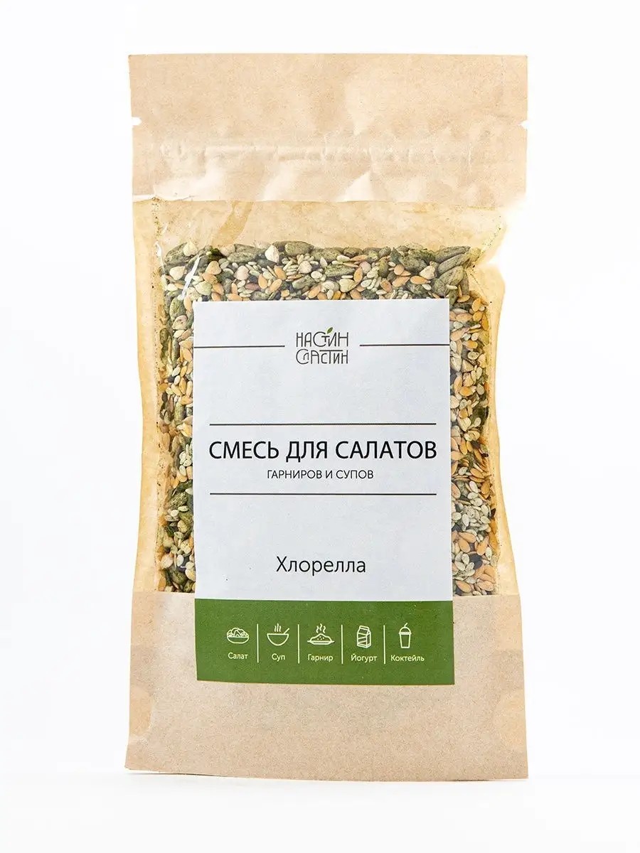 Смесь для гарниров с хлореллой - полезная добавка в любое блюдо.Станьте волшебницей на кухне! Постная еда, которую можно в пост. Великий пост. Используя микс с хлореллой, вы сможете сделать любое блюдо более полезным, аппетитным, оригинальным или эффектно украсите подачу на стол.Хлорелла - полезная водоросль с очень высоким содержанием белка. В ней - 20 аминокислот, среди них и незаменимые, а также витамины А, В1, В2, В6, С, К, PP, Е и кислоты, например, фолиевая.Так что, добавляя смесь для супов с хлореллой в свои блюда вы не только улучшаете их вкус, но и заботитесь о своём здоровье.Также в состав полезной смеси для салатов входит:- Кокосовая стружка- Семена подсолнечника- Семена белого льна- Семена белого кунжута- Семена кунжута черного- Зеленая пророщенная гречкаСмесь для салатов НастинСластин с хлореллой - незаменимый и вкусный источник микро и макро нутриентов для вашего стола! Замечательная комбинация! Этот натуральный продукт, созданный с учетом потребностей тех, кто заботится о своем организме и стремится к похудению, поможет вам достичь ваших целей. Смесь семян с хлореллой - это удивительный жиросжигатель, который не только стимулирует обмен веществ, но и дополняет ваше питание вкусными и полезными ингредиентами.