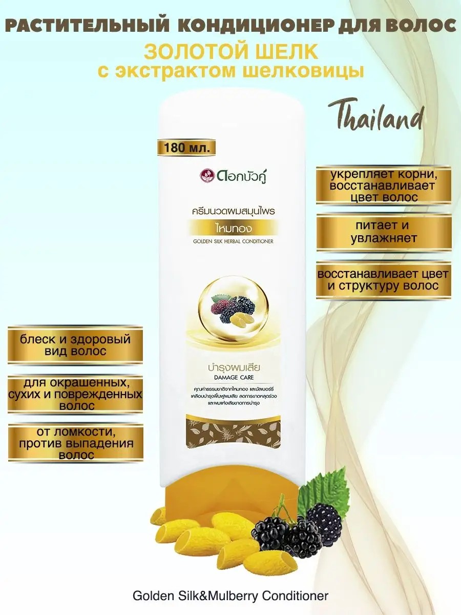 Травяной тайский кондиционер Золотой Шёлк бренда Twin Lotus (Твин Лотус) подходит даже для сильно повреждённых волос. Протеин шелковицы делает волосы сильными и здоровыми. Экстракт тутового дерева является мощным антиоксидантом. Кондиционер рекомендуется использовать в профилактических целях после 30 лет, когда волосы начинают терять силу, увеличивается вероятность ломкости и выпадения волос, может потускнеть цвет и появится седина. Так же кондционер подойдет для слабых и поврежденных волос. Особенно эффективен после применения шампуня этой же серии.