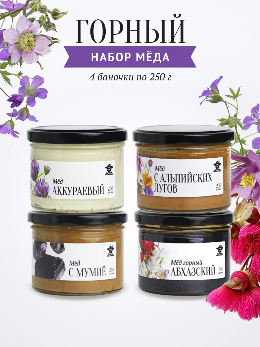 | Состав | Аккураевый мед 250 г; абхазский горный мед 250 г; мед с мумие 250 г; мед с альпийских лугов 250 г |