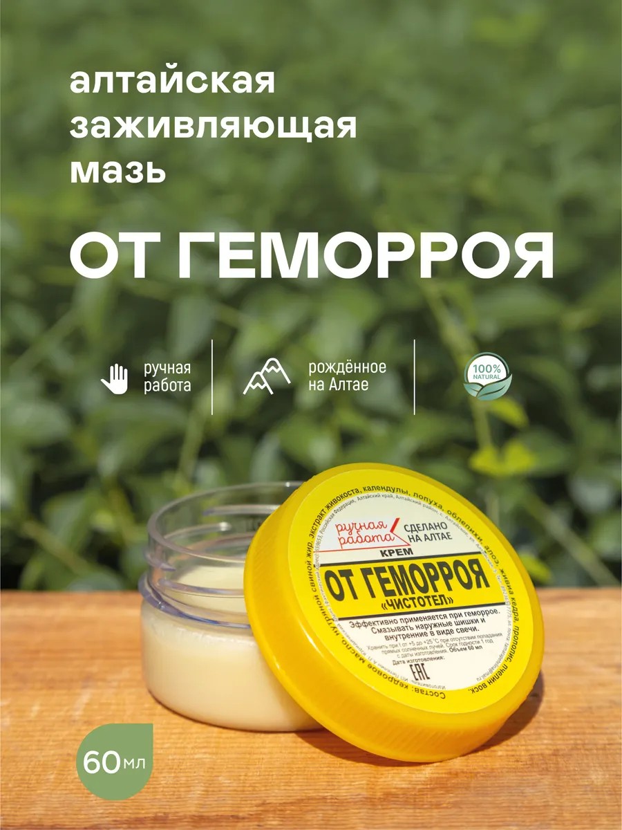 Алтайский органический крем ручной работы на основе чистотела, облепихи, живицы кедра и других ценных компонентов это лучший выбор для комфортного и эффективного лечения геморроя. Быстро и эффективно помогает устранить болевые ощущения и ускорить заживление и регенерацию поврежденных тканей в период обострения геморроя и для борьбы с выпадением геморроидальных шишек и узлов.