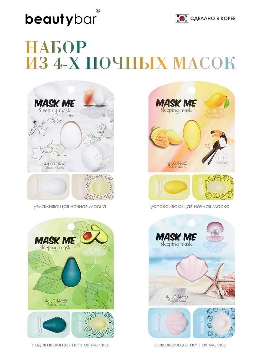Набор 4 ночные несмываемые маски для лица Beauty Me.