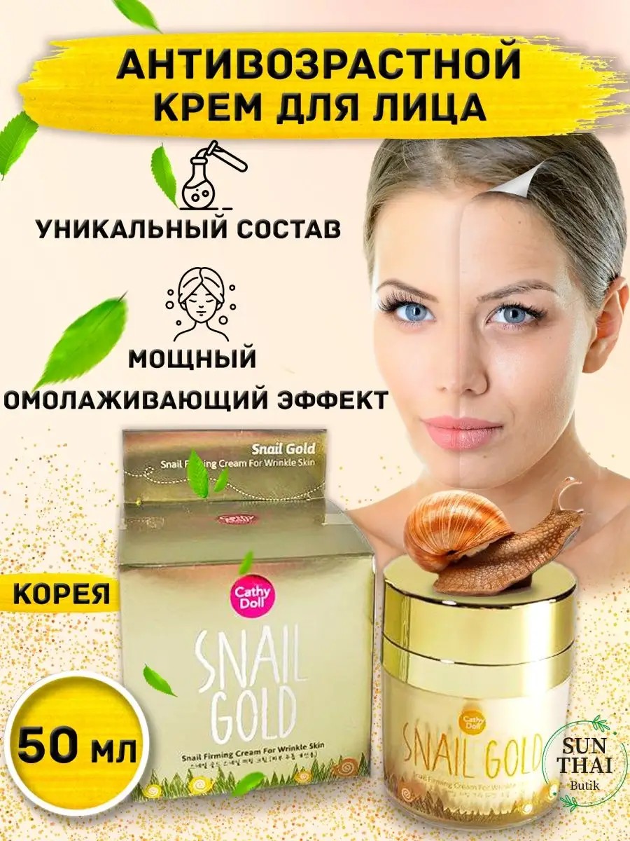 Anti-aging face cream with gold and snail mucin from Cathy Doll, Snail Gold. A high-tech cosmetic product, one of the best collaborations in the Thai-Korean cosmetics line. This anti-aging cream with bio-gold and snail mucus filtrate will help care for and regenerate aging, tired, and dry skin. Snail mucin is one of the most popular ingredients in Korean cosmetics, and Snail Gold by Cathy Doll is the pride of Asia's leading Korean brand. Fermented snail mucus extract has a very powerful rejuvenating effect. Typically, snail mucin-containing cosmetics have a cumulative rejuvenating effect and therefore require regular use. Snail mucin contains many natural ingredients, including allantoin, glycolic acid, collagen, and hyaluronic acid. All of this helps increase elasticity and rejuvenate facial skin, providing a peeling effect and hydration. Moisturizing ingredients are essential for aging skin in snail cosmetics. This cream with acids combines all the best qualities. It improves elasticity and provides a lifting effect, reducing the depth and severity of wrinkles. Snail mucus filtrate evens out skin texture and reduces scars, while hyaluronic acid moisturizes. Shea and macadamia oils nourish the skin, accelerate collagen synthesis, and rejuvenate with linoleic, oleic, eicosenoic, stearic, and arachidonic acids. Aloe heals, tightens pores, and protects the epidermis from aging, while bio-gold restores a youthful glow and freshness, creating a lifting effect. What do you need to know about this anti-aging cream with snail and bio-gold? Because of the mucus, the cream has a viscous, stretchy, and slightly sticky consistency, so it should be applied pointwise, gently and carefully, patting it in with your fingertips. Bio-gold works in close conjunction with snail mucus. Both components significantly regenerate the skin, smooth wrinkles, even out skin tone, and activate metabolic processes in aging skin. When used daily, apply Snail Gold twice daily.