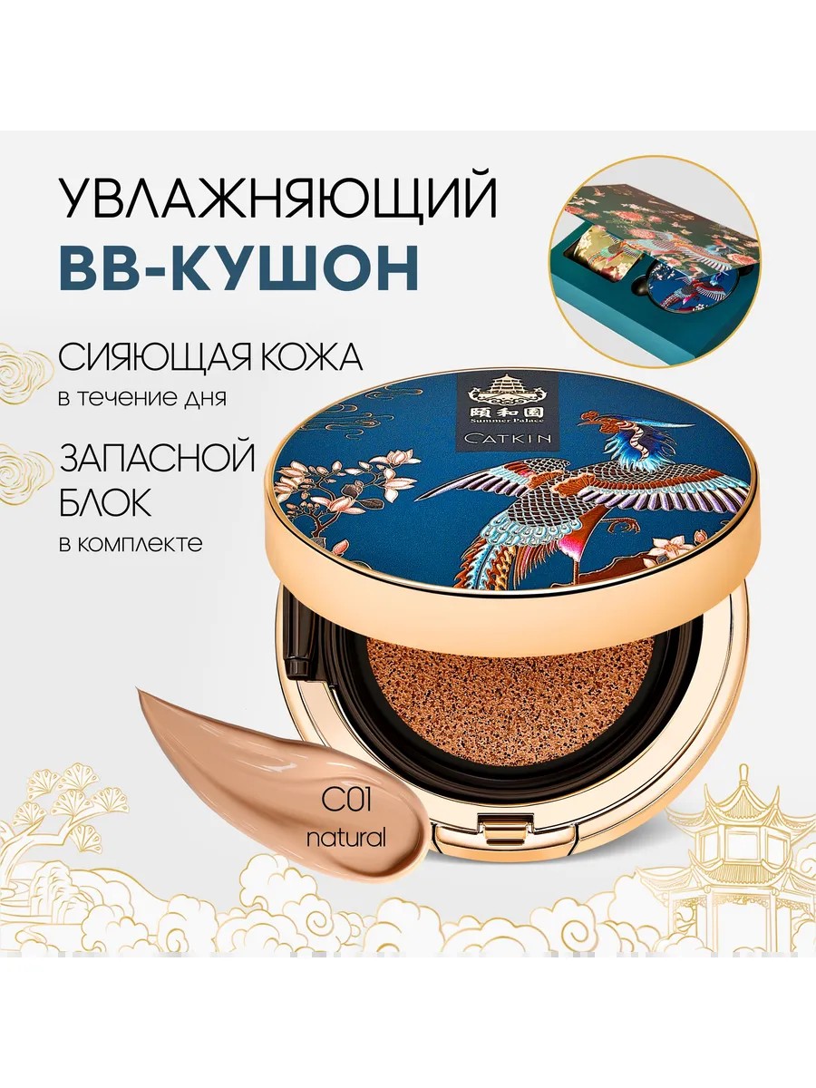 Увлажняющий солнцезащитный флюид кушон для лица CATKIN идеально выравнивает тон лица, ложится тонким слоем, подстраиваясь под естественные оттенки вашей кожи, скрывая несовершенства и обеспечивая стойкое невесомое покрытие в течении всего дня.\n\nКушоны для лица CATKIN с эффектом сияния - идеальная база под макияж. Он объединяет в себе достоинства 4-х средств по уходу за кожей лица: увлажнение и питание крема, удобство компактной пудры, лёгкость тонального BB-крема, стойкость тональной основы. Благодаря индексу SPF 15, средство защищает кожу от солнца, защищает от ранних морщин и преждевременного старения.\n\nКушоны для лица CATKIN подходят для всех типов кожи. Продается кушон в роскошной подарочной коробочке. Внутри шикарный футляр с кушоном и запасной сменный блок. Футляр вмещает зеркало, мягкий фирменный спонж для нанесения кушона и губку, пропитанную тональным флюидом.\n\nФормула BB кушона обладает уникальным составом. Комплекс натуральных компонентов (экстракт ламинарии, центеллы азиатской и листьев розмарина) активно увлажняет и омолаживает кожу лица в течение дня, японский горец борется с проявлениями пигментации, осветляет, делая тон кожи более ровным. Экстракт шлемника байкальского замедляет процесс старения, является природным фотофильтром и защищает кожу от солнечного излучения. Экстракт листьев зеленого чая улучшает эластичность кожи, а экстракт аптечной ромашки ее смягчает. Кожа напитана влагой, излучает здоровое сияние и свежесть!\n\nФутляр роскошен, как и сам продукт, создан в стиле китайской живописи и являются настоящими амулетами для привлечения любви, удачи и благополучия. На упаковке красуется легендарная и таинственная птица Феникс - символ бессмертия и возрождения.\nХарактеристики:\n* Тип: Кушон\n* SPF: SPF 15+\n* Текстура: Кремовая\n* Тип кожи: Для всех типов кожи\n* Особенности состава: Не тестируется на животных\n* Целевая аудитория: Взрослая\n* Единиц в одном товаре: 2\n* Объем: 26 мл\n* Вес: 26 г\n* Упаковка: Блистер