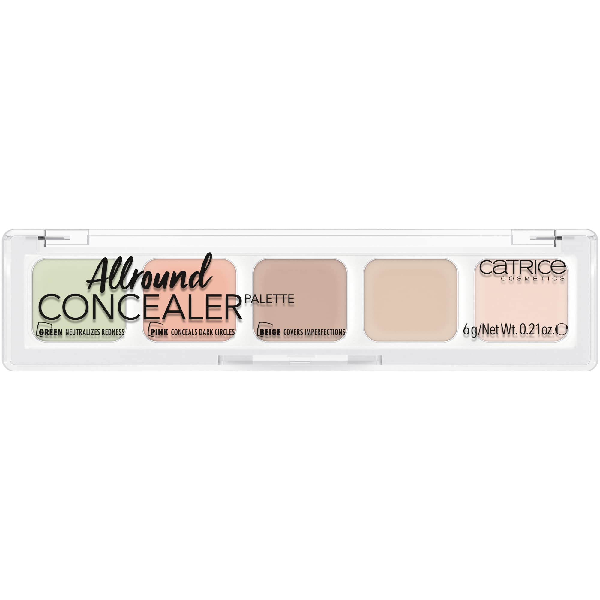 In a convenient MULTI pack. A range of ways to always look your best. With this set of 5, you can even out skin tone (beige tones), cover dark circles (pink tones), and conceal redness (green tint). The colors can be mixed for a personalized result. The creamy texture is pleasant to apply. We say no to animal testing. Cosnova is listed internationally with essence and CATRICE at PETA Germany and PETA. INGREDIENTS Beige Brown Ingredients: Ethylhexyl Palmitate, Aluminum Starch Octenylsucinate, Isostearyl Isostearate, Mica, Talc, Silica, Ceresin, Carnauba Wax (Cornicia Cerfera), Phenyl Wax, Phenyl Methicone. PRYLIC Triglyceride, Tocopheryl Acetate, Aloe Barbadensis Leaf Extract, May Contain: CI 77491, CI 77492, CI 77499 (Iron Oxides), CI 77891 (Titanium Dioxide). Pink Green Ingredients: Ethylhexyl Palmitate, Ocyldodecanol, Phenyl Trimethicone, Microcrystalline Cera, Polyacrylate, Silica, Ceresin. Tocopherol. Aloe Barbadensis Leaf Extract, Dimethyl Ethyl Acid, PABA, Main Ingredients: CI 15850 (Red 6 Lake), CI 19140 (Yellow 5 Lake), CI 42090 (Blue 1 Lake), CI 77007 (Ultramarter). INES), CI 77492, CI 77499 (ferric oxides), CI 77510 (ferric ferrocyanide), CI 77891 (titanium dioxide). INSTRUCTIONS FOR USE Concealer Palette. Beige - Corrects skin imperfections. Pink: Conceals dark circles. Green: Balances skin redness. See moreLong-lasting, mattifying. We say no to animal testing. Cosnova is listed internationally with essence and CATRICE by PETA Germany and PETA. Vegan, oil-free, fragrance-free, alcohol-free, preservative-free, paraben-free, microplastic-free, nanoparticle-free, and acetone-free. Conceals redness and skin imperfections. Covers dark circles. Five shades for a flawless complexion.Catrice Lot de 3 correcteurs Allround n 010 - Nude - Longue durée - Matifiant - Végétalien - Sans huile - Sans parfum - 3 x 6 g 6 g (3er Pack) 10DESCRIPTION DU PRODUIT DESCRIPTION DU PRODUIT Dans un pack pratique MULTI. Une gamme de façons de toujours avoir fière allure. Avec ce lot de 5, vous pouvez compenser les irrégularités de la peau (tons beige), couvrir les cernes (tons rose) et masquer les rougeurs de la peau (teinte verte). Les couleurs peuvent être mélangées pour un résultat personnalisé. La texture crémeuse est agréable à appliquer. Nous disons non à l'expérimentation animale. Cosnova est répertorié internationalement avec essence et CATRICE chez PETA Allemagne et PETA. INGRÉDIENTS Ingrédients beige marron : palmitate d'éthylhexyle, aluminum starch octénylsucinate, isostéarate d'isostéaryle, mica, talc, silica, ceresine, carnauba (cornicia cerfera), cire de phényle, méthicone phényle. PRYLIC . TRIGLYCERIDE, ACETATE DE TOCOPHERYL, EXTRAIT DE LEAF D'ALOE BARBADENSIS, MAY CONTENU : CI 77491, CI 77492, CI 77499 (oxydes de fer), CI 77891 (dioxyde de titane). Ingrédients rose vert : palmitate d'éthylhexyle, ocyldodécanol, triméthicone phényle, microcristalline cera, cera microcristalline (cire de microcristalline), polyacrylate de polyacrylate de polyacrylate 2, silica, cerésine. TOCOPHEROL. Extrait de feuille d'aloe barbadensi, acide éthylique diméthyle PABA, contenu principal : CI 15850 (rouge 6 lake), CI 19140 (jaune 5 lake), CI 42090 (bleu 1 lake), CI 77007 (ULTRAMARMARTER). INES), CI 7. 7492, CI 77499 (oxydes de ferrique), CI 77510 (ferrocyanide ferrique), CI 77891 (dioxyde de titane). MODE D'EMPLOI Palette de correcteurs. Beige - Corrige les irrégularités de la peau. Rose : masque les cernes. Vert : équilibre les rougeurs de la peau. Voir plusLongue durée, matifiante. Nous disons non à l'expérimentation animale. Cosnova est répertorié internationalement avec essence et CATRICE chez PETA Allemagne et PETA. Végétalien, sans huile, sans parfum, sans alcool, sans conservateurs, sans paraben, sans microparticules plastiques, sans nanoparticules, sans acétone. Masquage des rougeurs et des irrégularités de la peau. Couverture des cernes. Cinq couleurs pour un teint parfait.