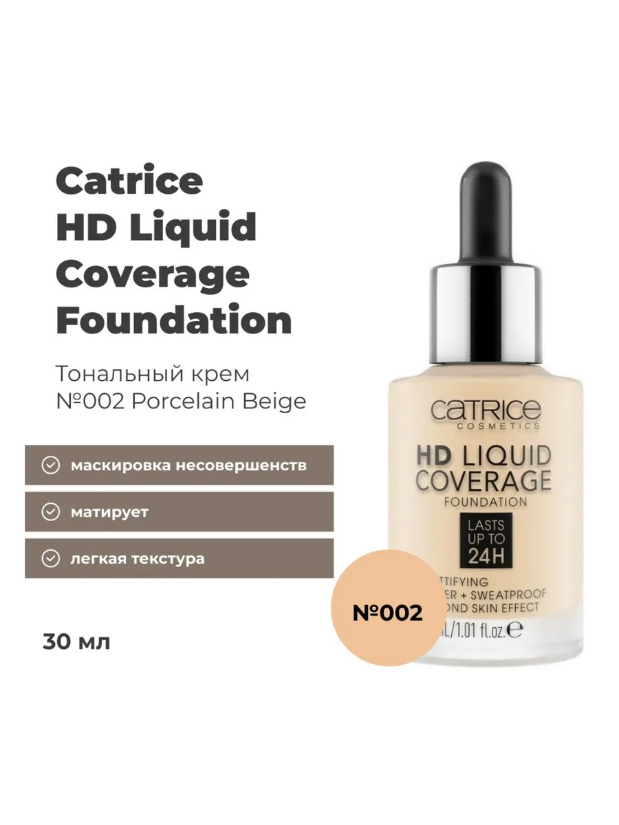Тональный крем HD Liquid Coverage - ваш лучший помощник в создании естественных и эффектных макияжей! Профессиональное бьюти средство женской косметики CATRICE поможет вам добиться эффекта "второй кожи" и позволит сохранить безупречный цвет лица и бархатисто-матовый финиш до 24 часов! Тональная основа содержит ниацинамид - этот компонент обладает противовоспалительным и обеззараживающим действием, помогает осветлить пигментные пятна, улучшает цвет лица и делает кожу матовой и гладкой. Такой тональник поможет вам не только в маскировке прыщей, синяков и постакне, но и уходе за лицом. Жидкая ультралегкая текстура обеспечивает плотное покрытие и устойчива к воздействию пота и воды. Вы можете использовать тон для создания образов на вечеринку или дискотеку - будьте уверены, ваш макияж выдержит самые активные танцы! Тоналка подходит для девушек подростков и взрослых женщин - она предназначена для жирной, проблемной и нормальной кожи, может использоваться на комбинированной и зрелой. В каталоге доступны светлые и темные оттенки - вы легко подберете тон под свой цвет кожи и сможете аккуратно подчеркнуть красоту своего лица, сохранив естественность и натуральность! Формула не содержит минерального масла, частиц микропластика и парабенов.