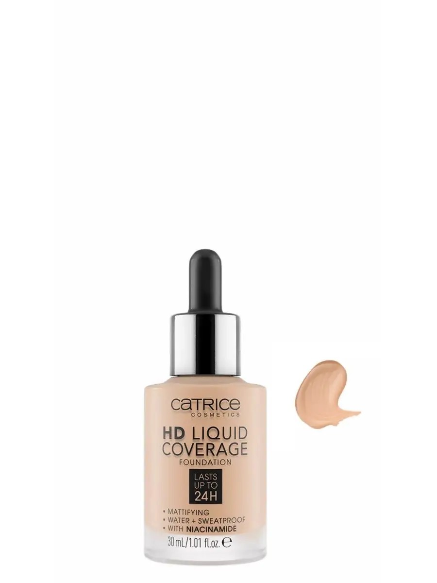 Тональный крем для лица/Тональная основа для лица/Жидкая тональная основа для лица HD Liquid Coverage Foundation Catrice - это легендарный тональный крем для любительниц макияжаЭтот флюид поможет создать безупречное покрытие с эффектом "второй кожи" и гладким матовым финишем. Пигментированная жидкая текстура легко распределяется кистью или спонжем, отлично выравнивает тон с первого слоя и сливается с кожей, обеспечивая безупречную стойкость в течение дня. Практичный дозатор-пипетка позволяет нанести тональную основу непосредственно на кожу, тем самым контролируя расход средства. Тон от Catrice подходит для жирной и комбинированной кожи.Тональная основа обладает невесомой консистенцией. Она невидимой вуалью ложится на кожу, оставаясь незаметной для окружающих. Средство обладает водостойким эффектом со стойкостью до 24 часов.